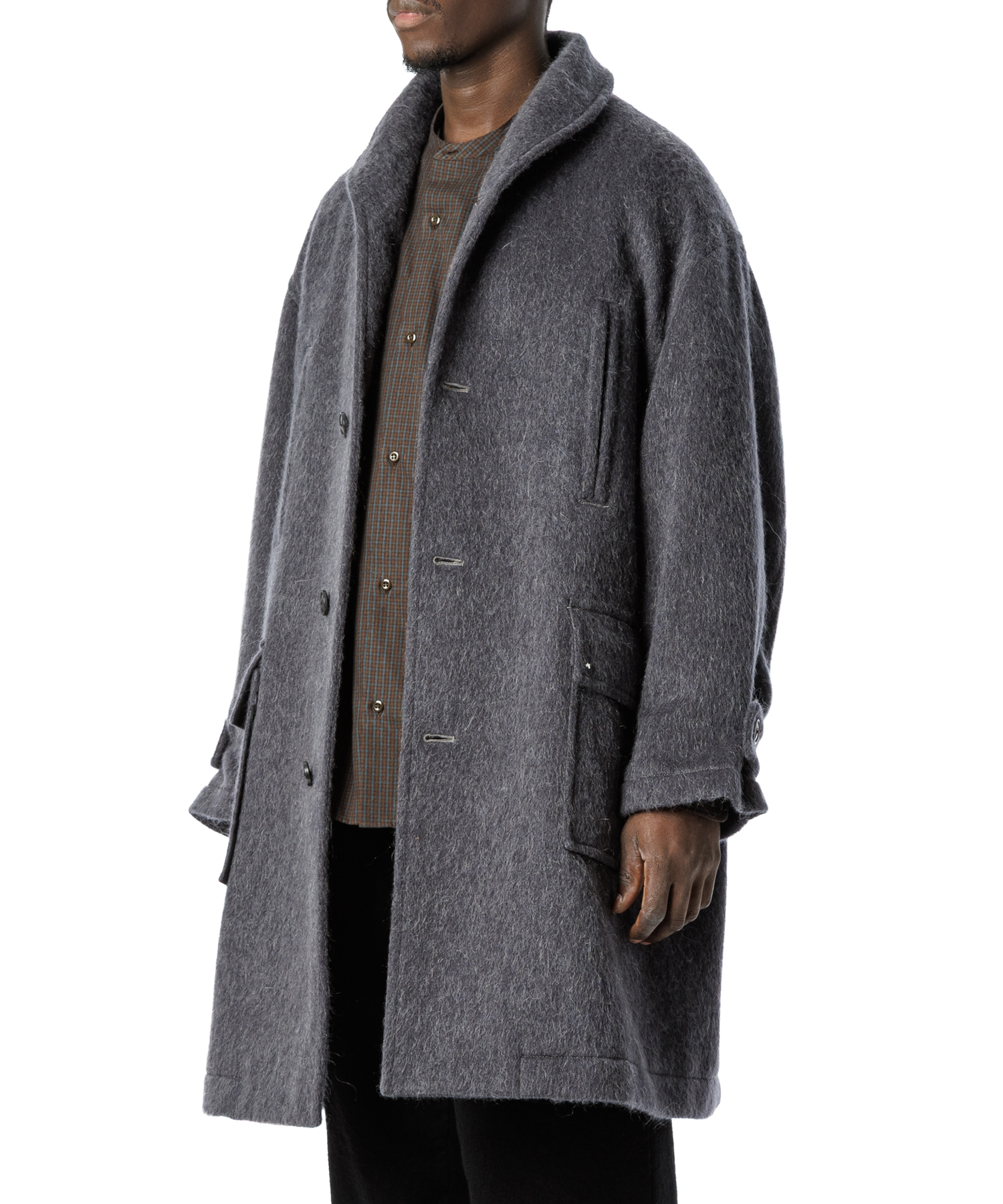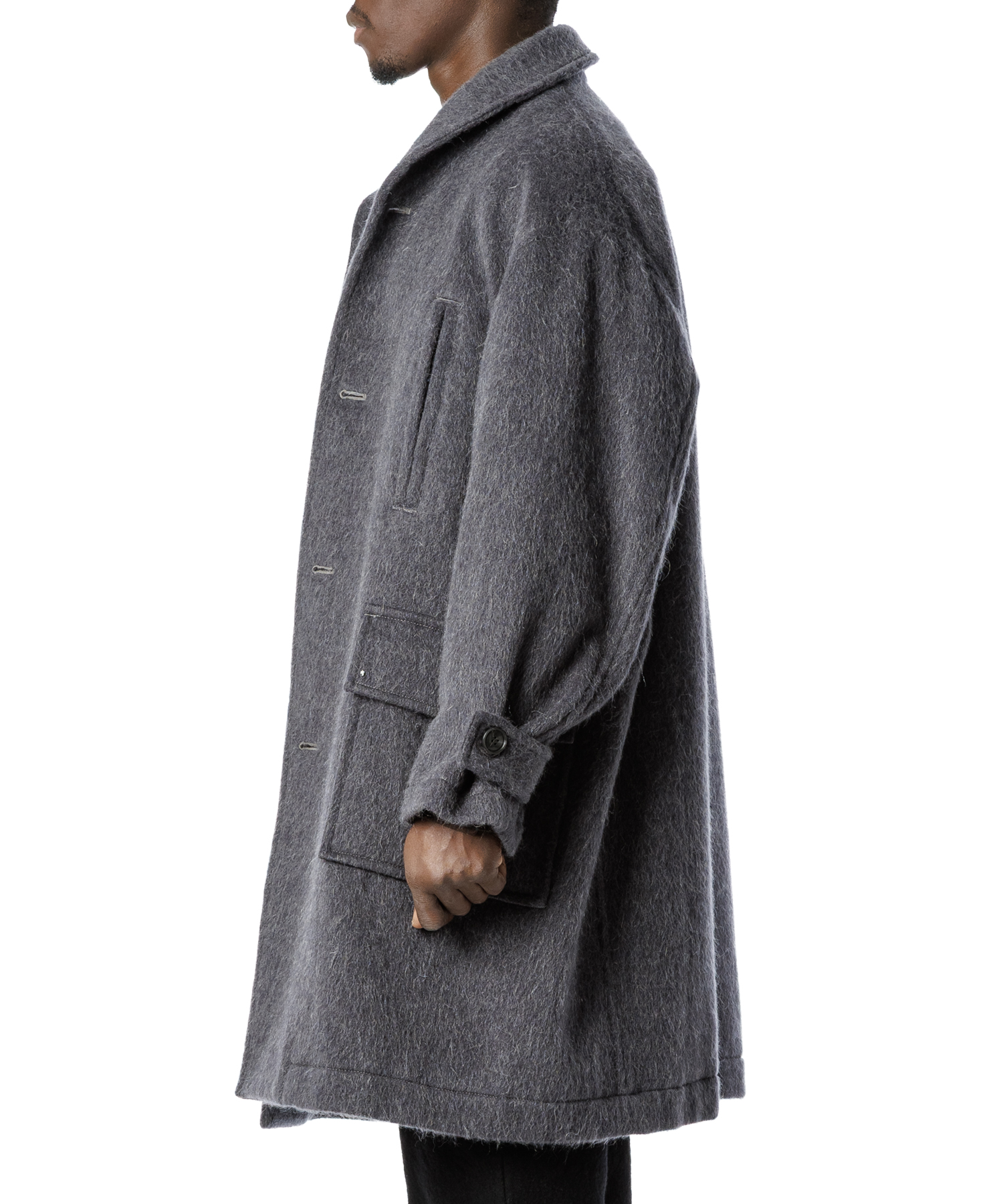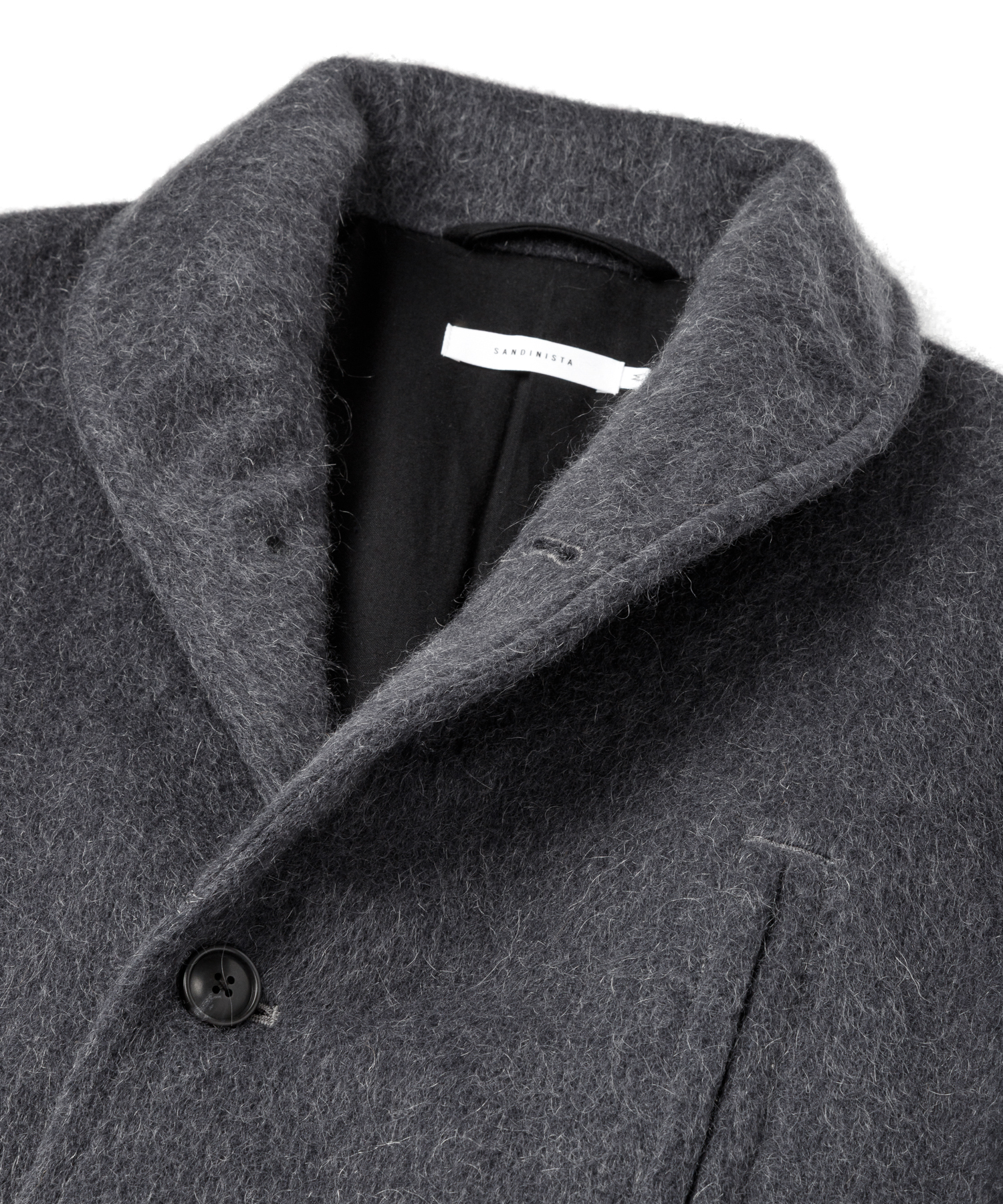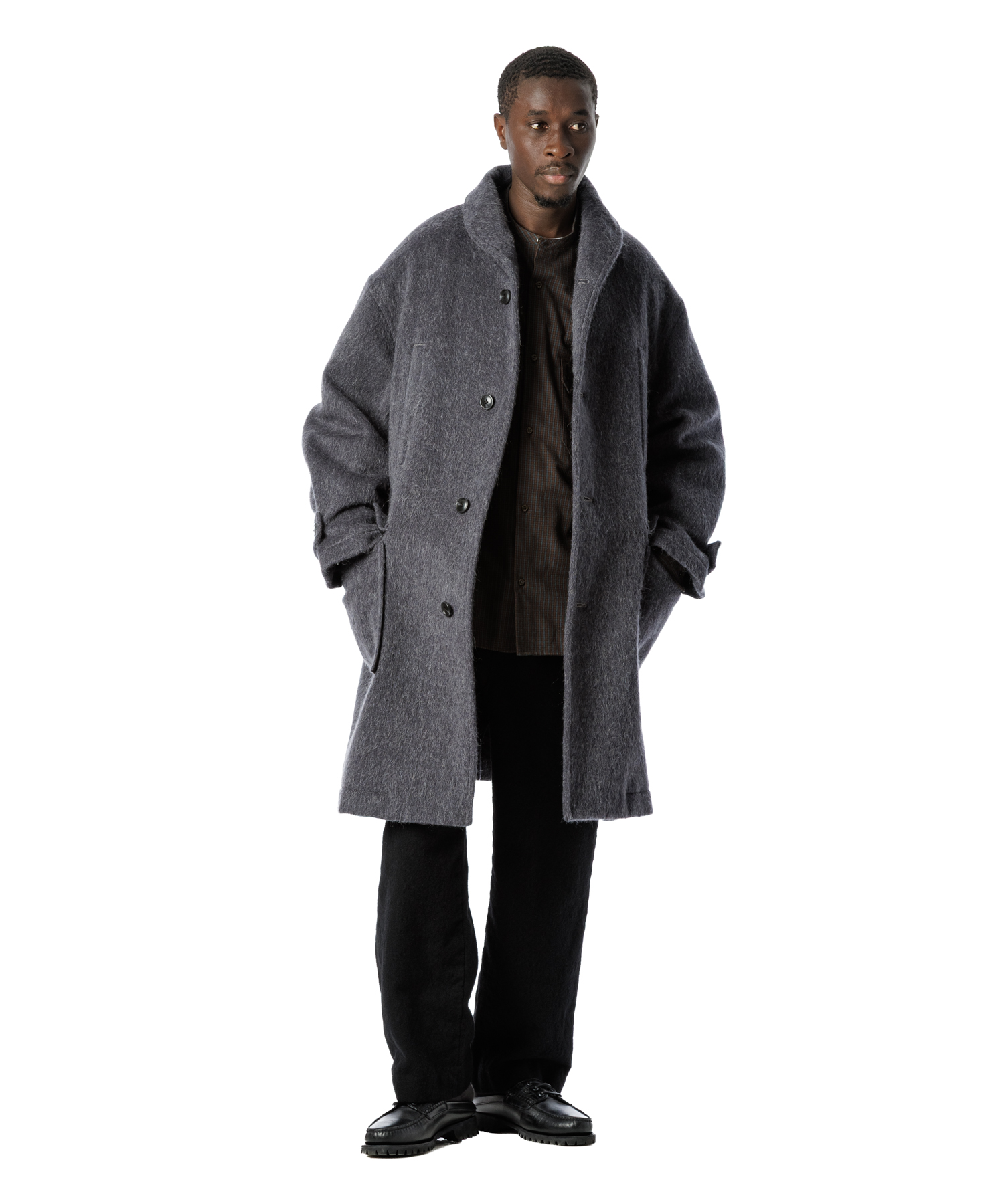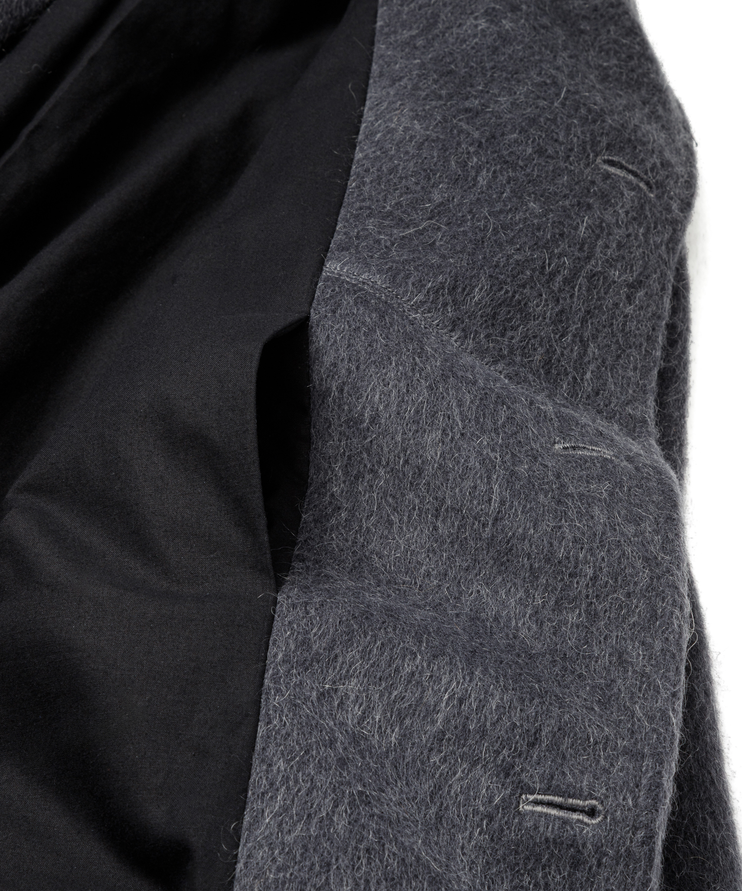 上質なキッドモヘヤブレンドのシャギーウール生地を使用した、ゆったりシルエットのショールカラーコートです。キッドモヘヤは収穫量が極めて少なく、ハイグレードな原料として重宝されています。細くて柔らかく、ふわふわしたタッチと暖かさを生かしたシャギーが特徴の素材です。袖裏地のキュプラ (ベンベルグ)は繊維自身が水分を含む (公定水分率11%)、呼吸する繊維です。湿・放湿性にも優れ、静電気も起きにくい裏地に最適な素材です。