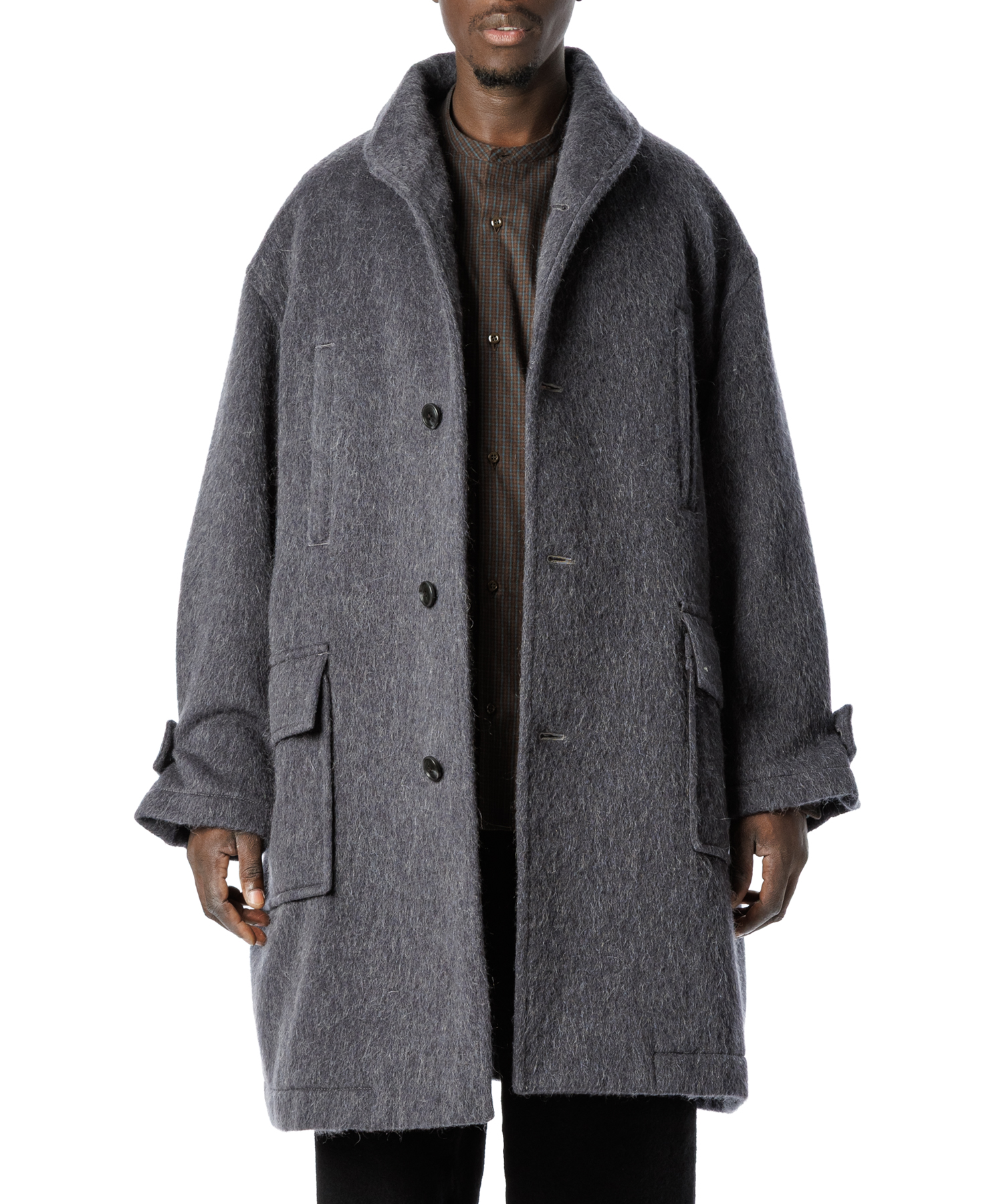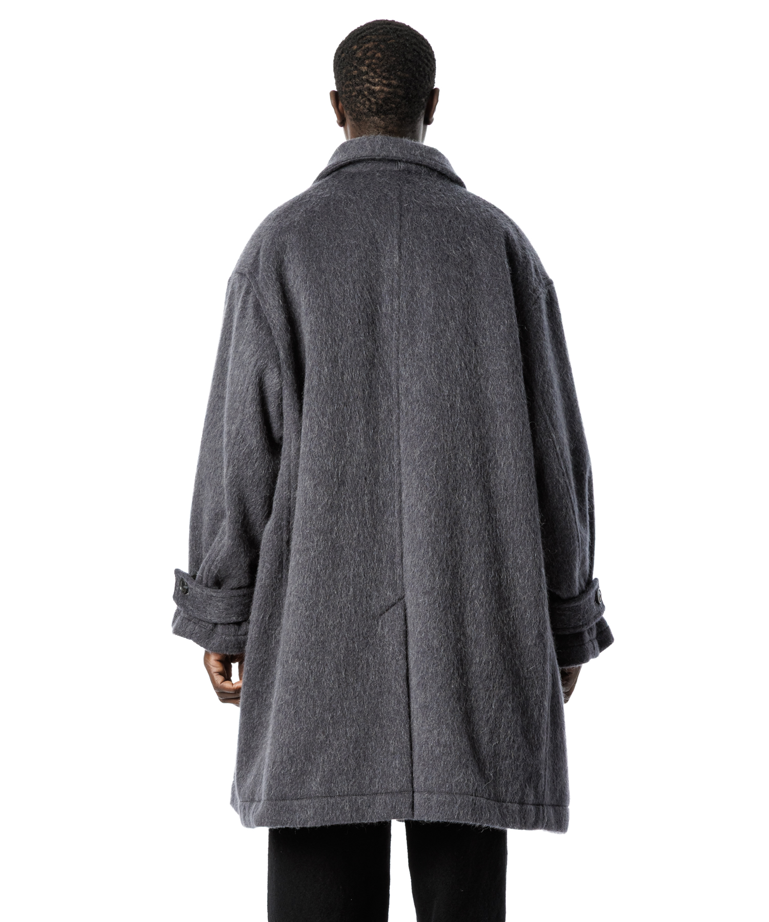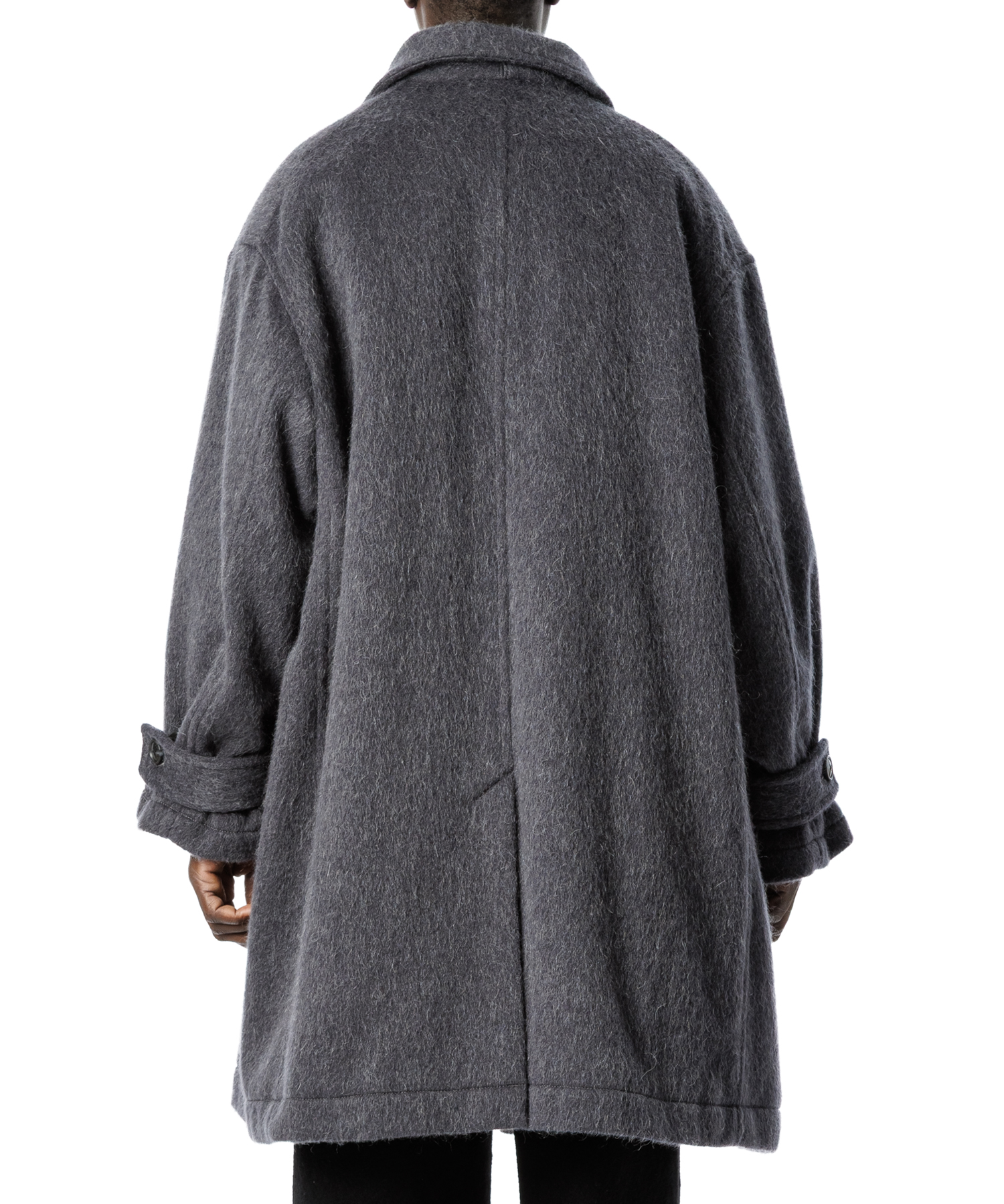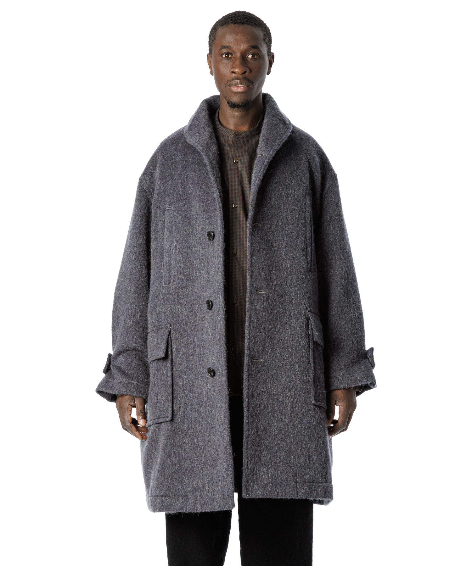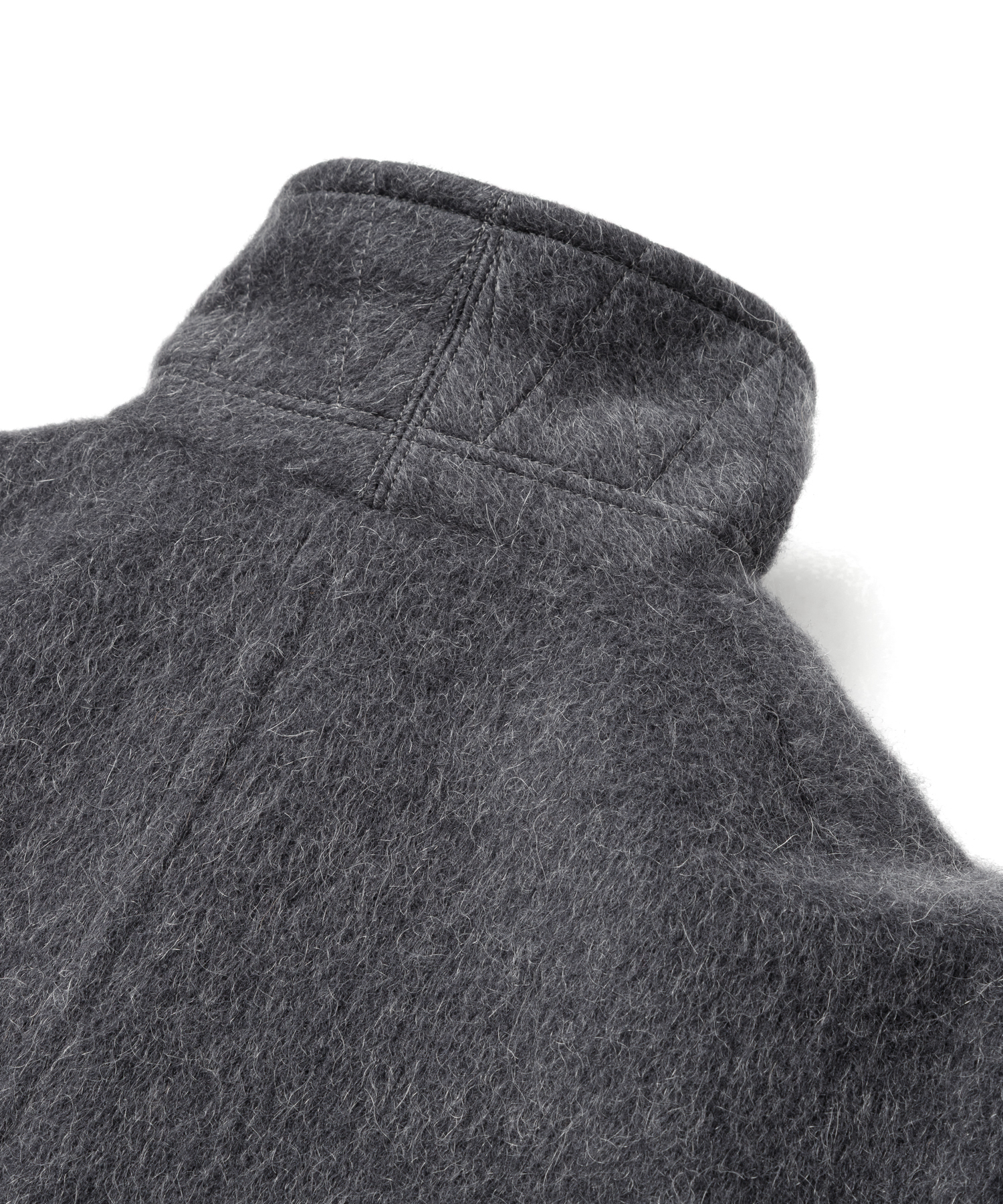 上質なキッドモヘヤブレンドのシャギーウール生地を使用した、ゆったりシルエットのショールカラーコートです。キッドモヘヤは収穫量が極めて少なく、ハイグレードな原料として重宝されています。細くて柔らかく、ふわふわしたタッチと暖かさを生かしたシャギーが特徴の素材です。袖裏地のキュプラ (ベンベルグ)は繊維自身が水分を含む (公定水分率11%)、呼吸する繊維です。湿・放湿性にも優れ、静電気も起きにくい裏地に最適な素材です。
