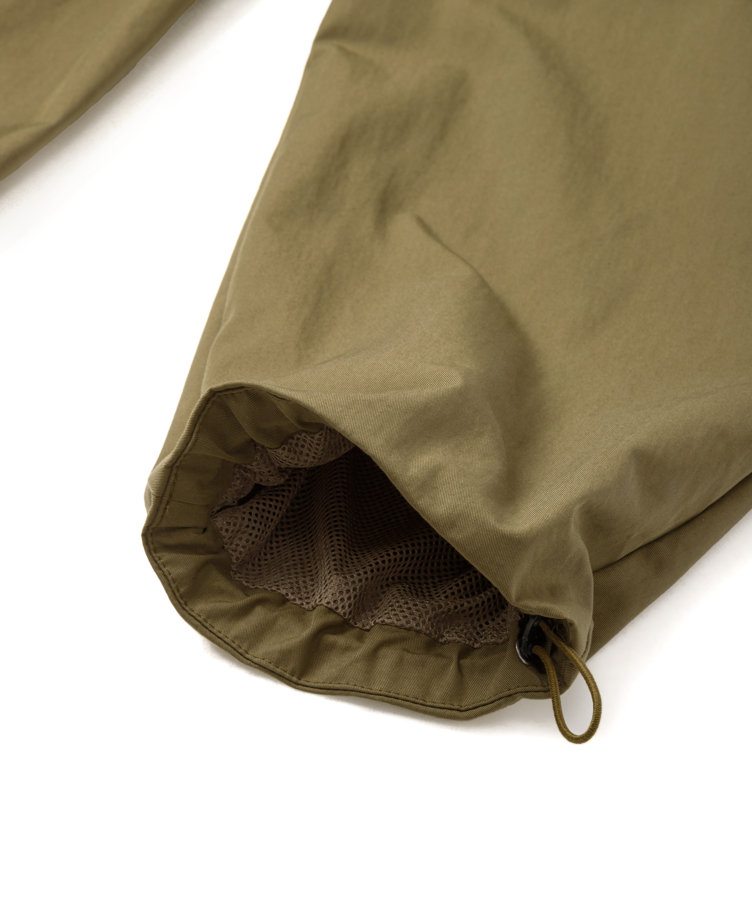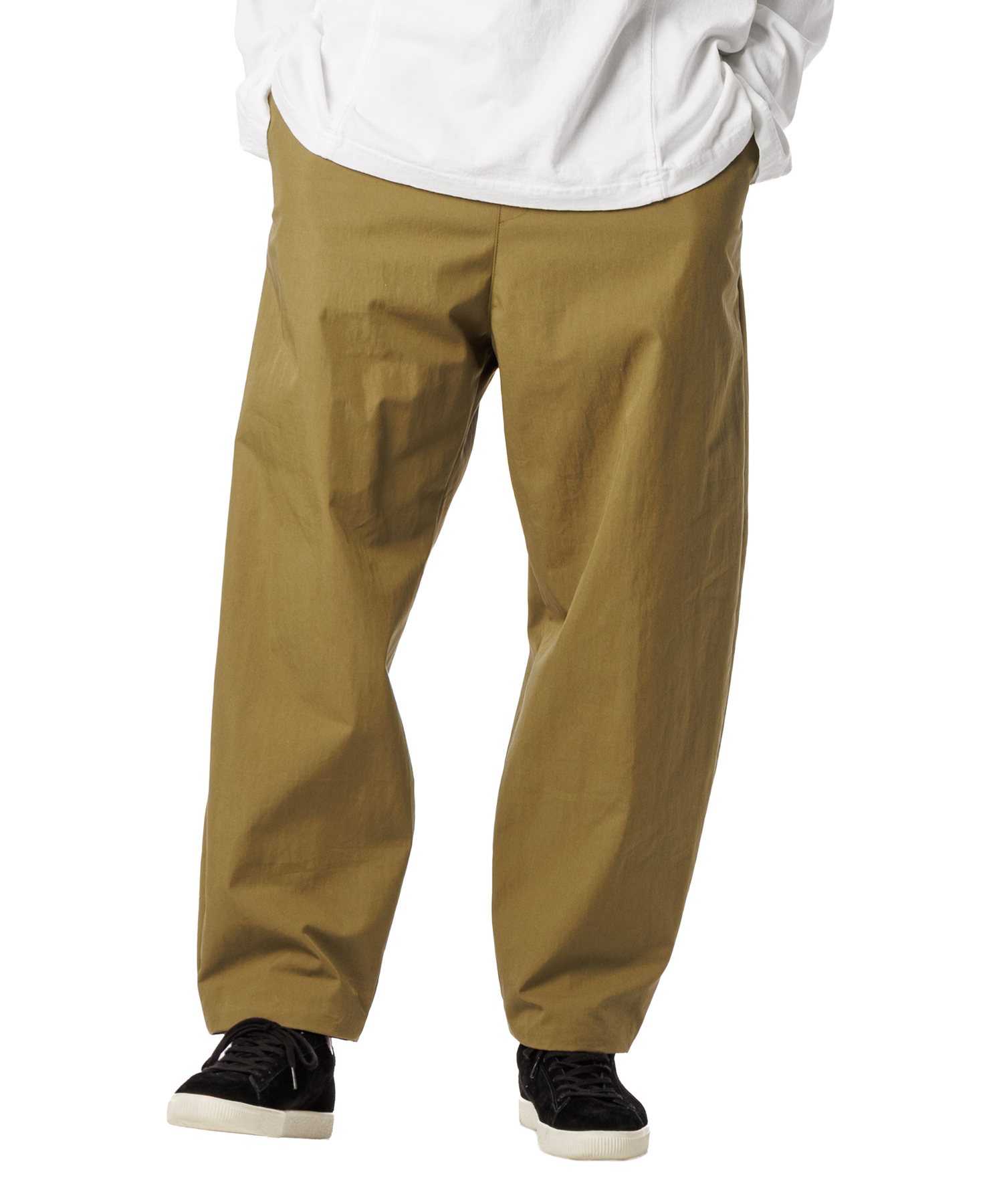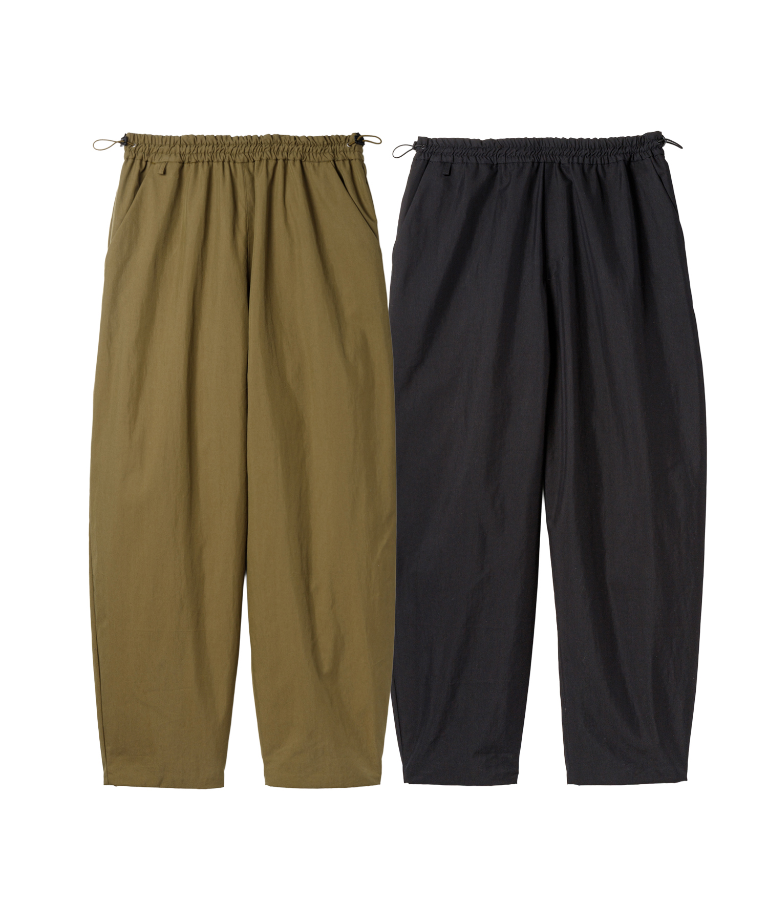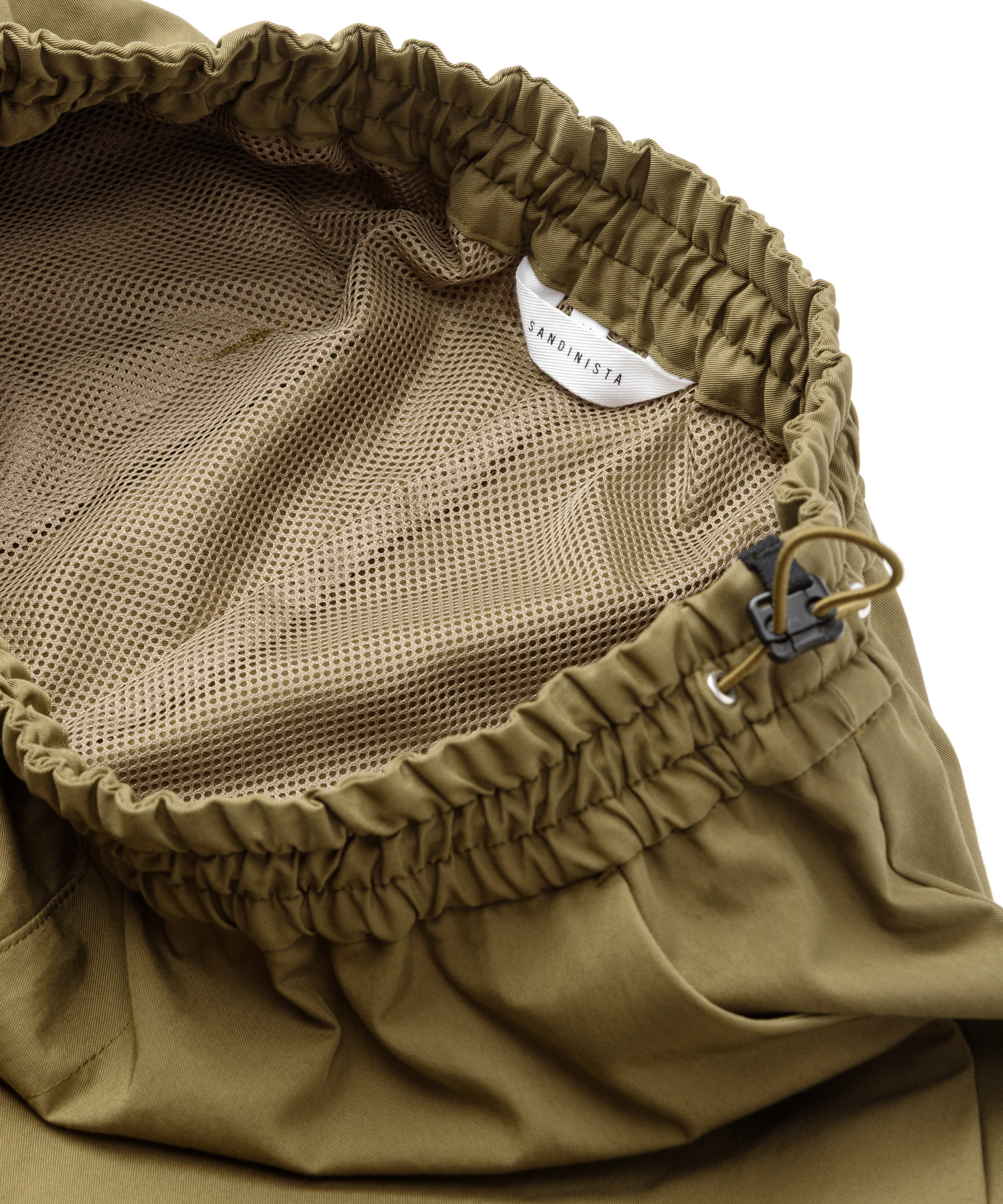 特殊なコットンナイロン撥水ツイル生地使用した、総裏イージーパンツです。シルエットの特徴はゆったりシルエットから若干裾にかけてテーパードしています。生地の特徴は経糸にオーガニックコットン、緯糸にリサイクル漁網ナイロンを使用した、表面にしっかりとしたシャカシャカ感がある素材です。裏地のCOOLMAXメッシュは爽快感があり、速乾性にも優れた素材です。ウエストにはゴム&ゴム紐が通ってます。(脇で調節可能仕様)また裾にもゴム紐が通ってますので、シーンに合わせて絞れます。