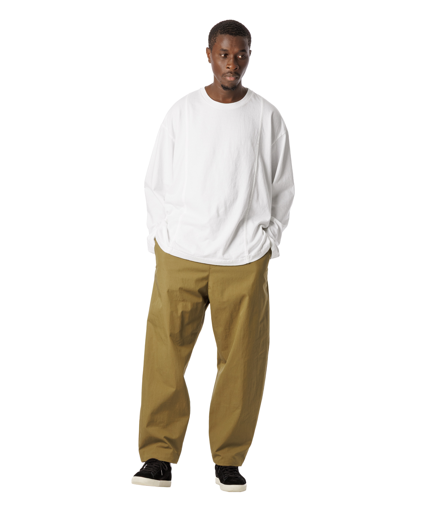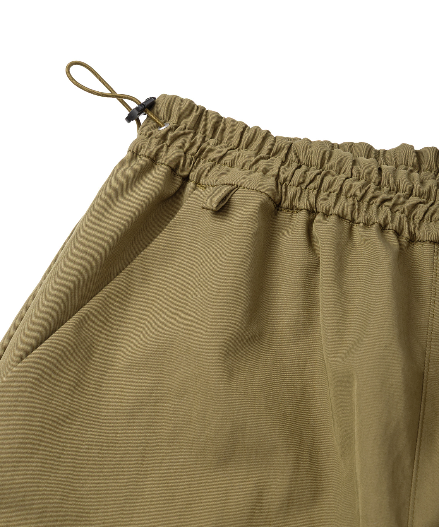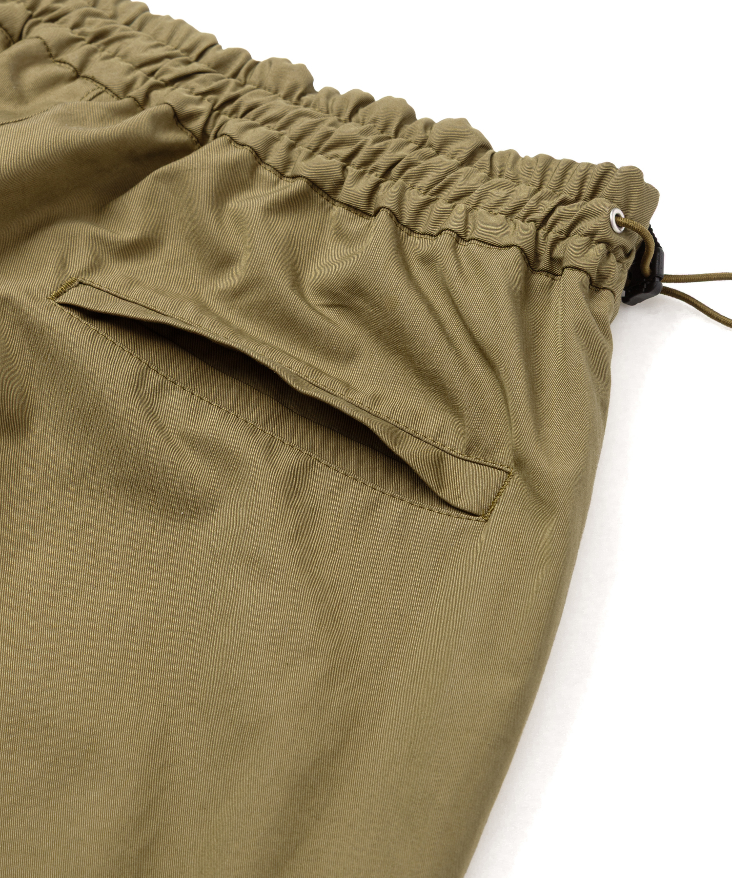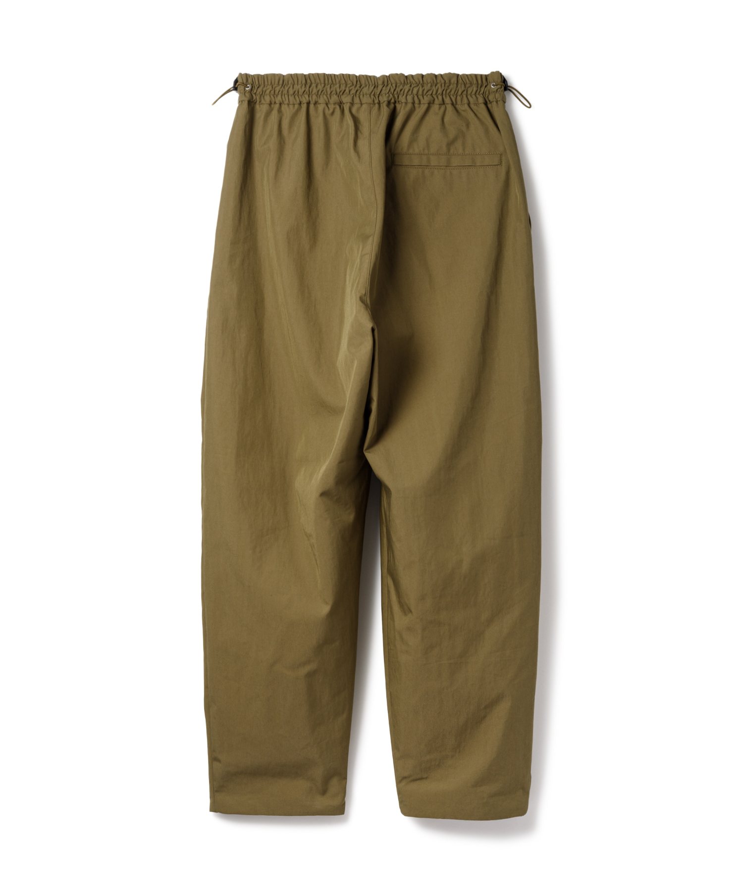 特殊なコットンナイロン撥水ツイル生地使用した、総裏イージーパンツです。シルエットの特徴はゆったりシルエットから若干裾にかけてテーパードしています。生地の特徴は経糸にオーガニックコットン、緯糸にリサイクル漁網ナイロンを使用した、表面にしっかりとしたシャカシャカ感がある素材です。裏地のCOOLMAXメッシュは爽快感があり、速乾性にも優れた素材です。ウエストにはゴム&ゴム紐が通ってます。(脇で調節可能仕様)また裾にもゴム紐が通ってますので、シーンに合わせて絞れます。