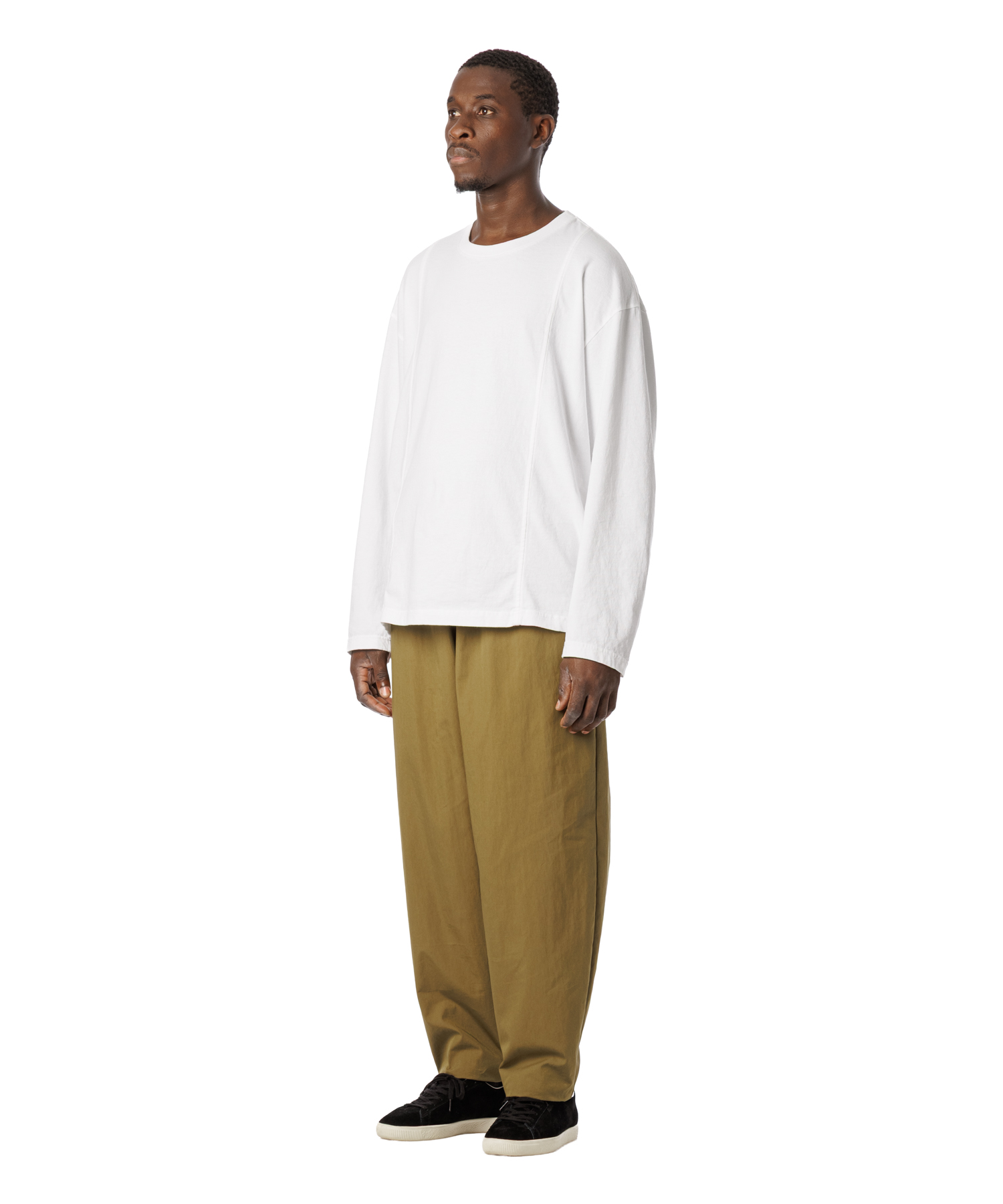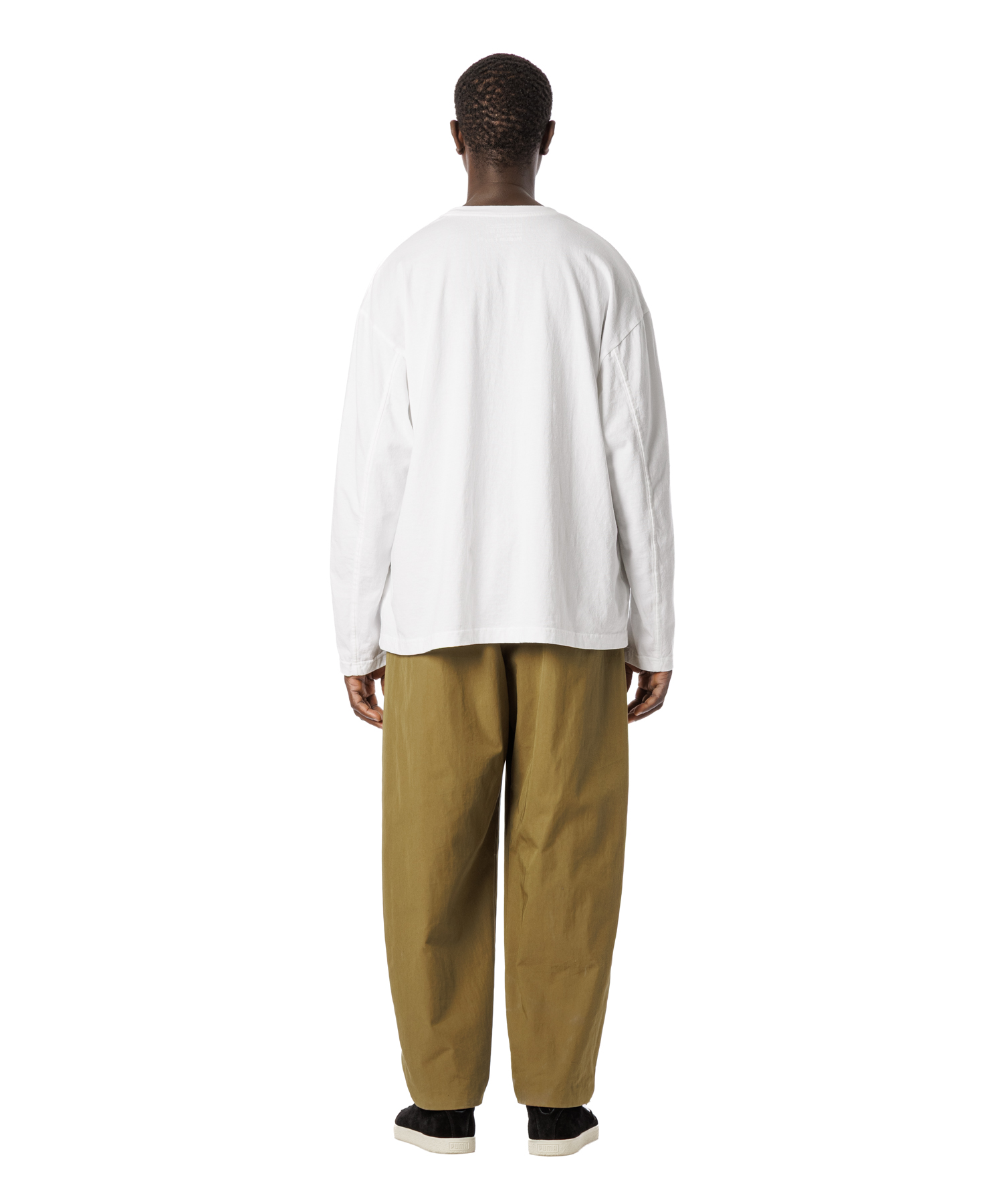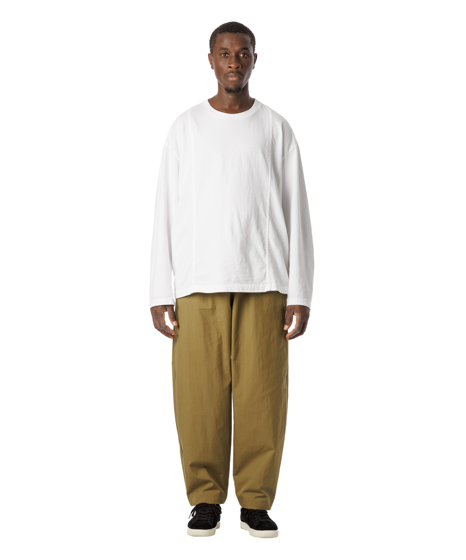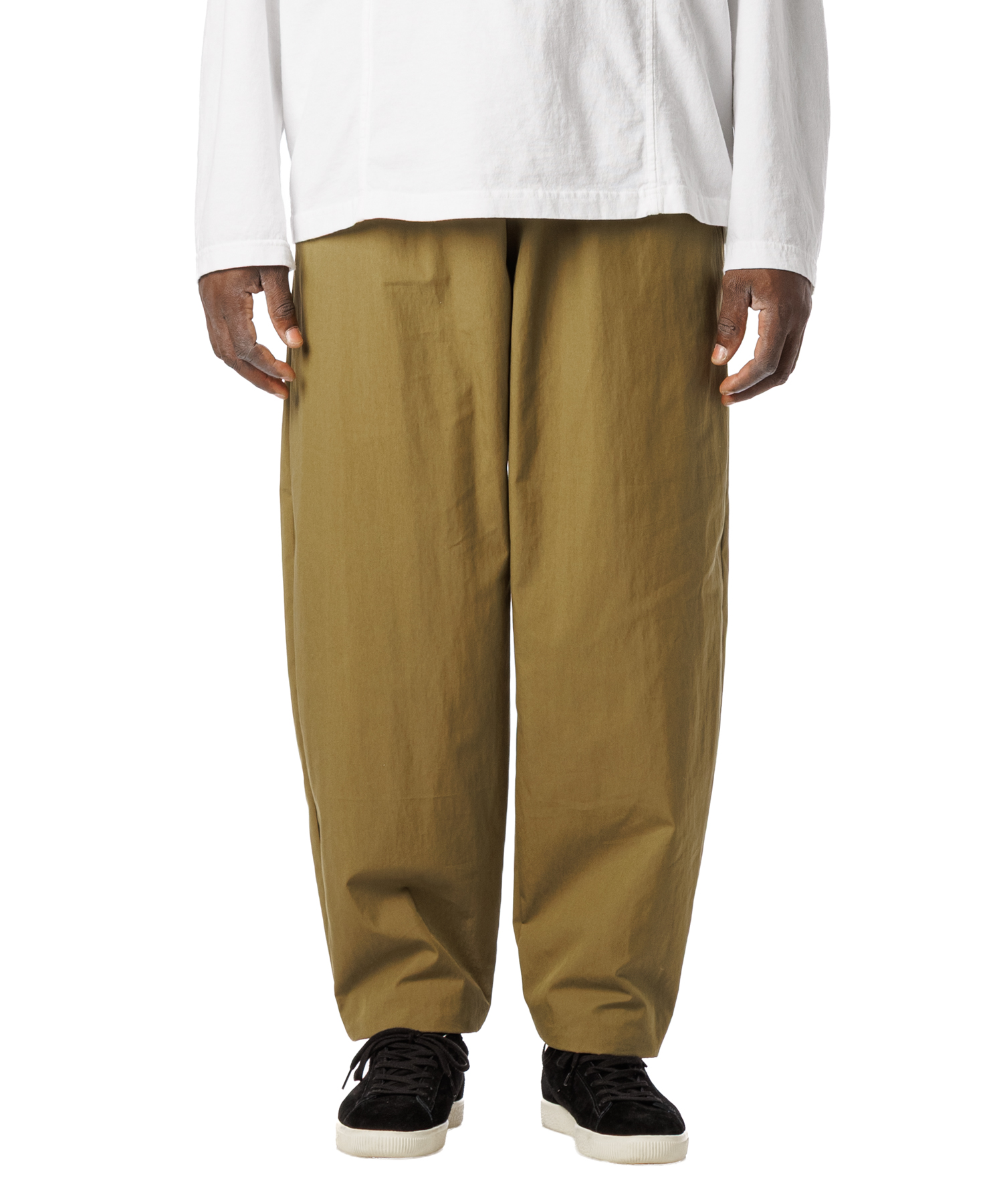 特殊なコットンナイロン撥水ツイル生地使用した、総裏イージーパンツです。シルエットの特徴はゆったりシルエットから若干裾にかけてテーパードしています。生地の特徴は経糸にオーガニックコットン、緯糸にリサイクル漁網ナイロンを使用した、表面にしっかりとしたシャカシャカ感がある素材です。裏地のCOOLMAXメッシュは爽快感があり、速乾性にも優れた素材です。ウエストにはゴム&ゴム紐が通ってます。(脇で調節可能仕様)また裾にもゴム紐が通ってますので、シーンに合わせて絞れます。