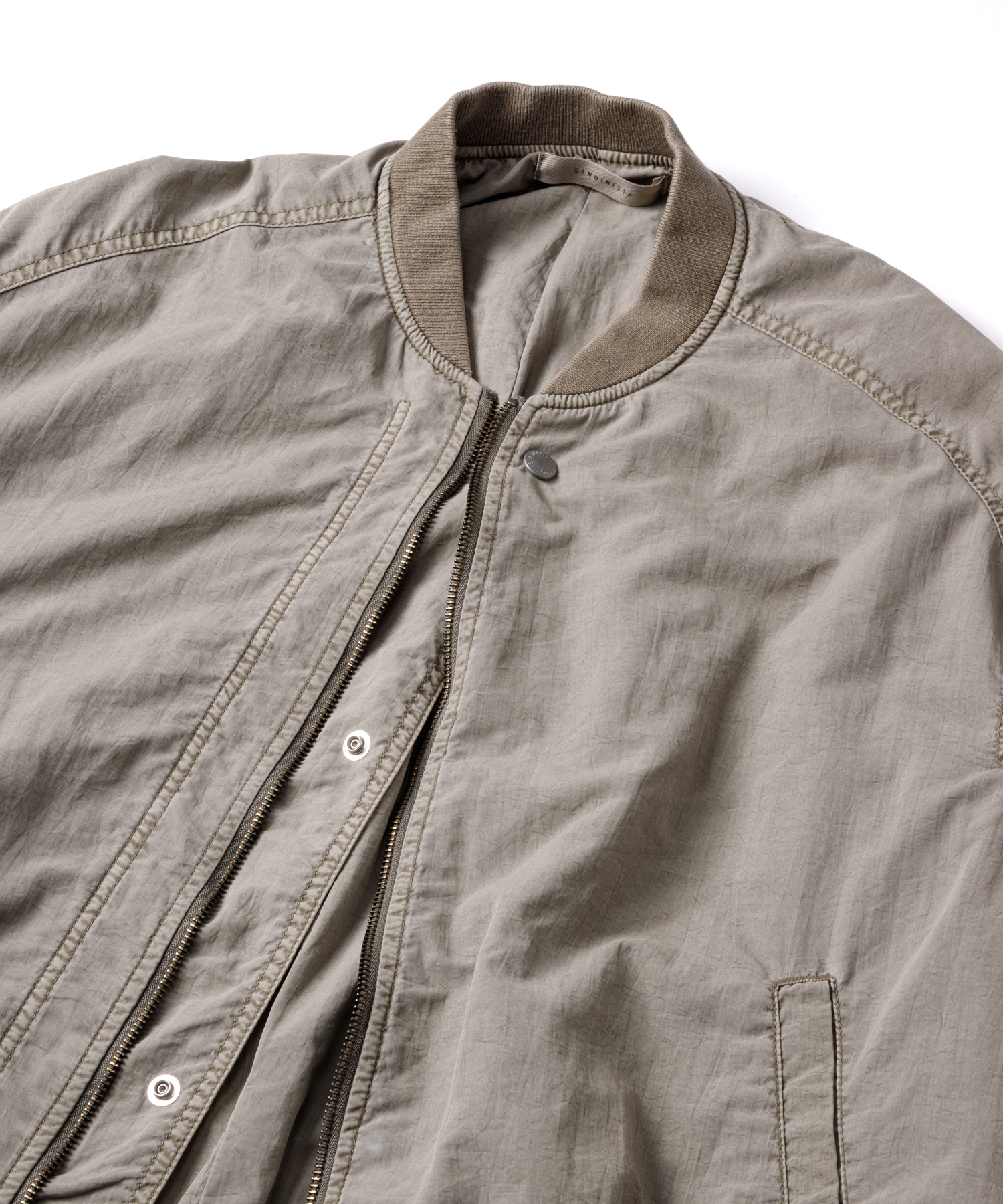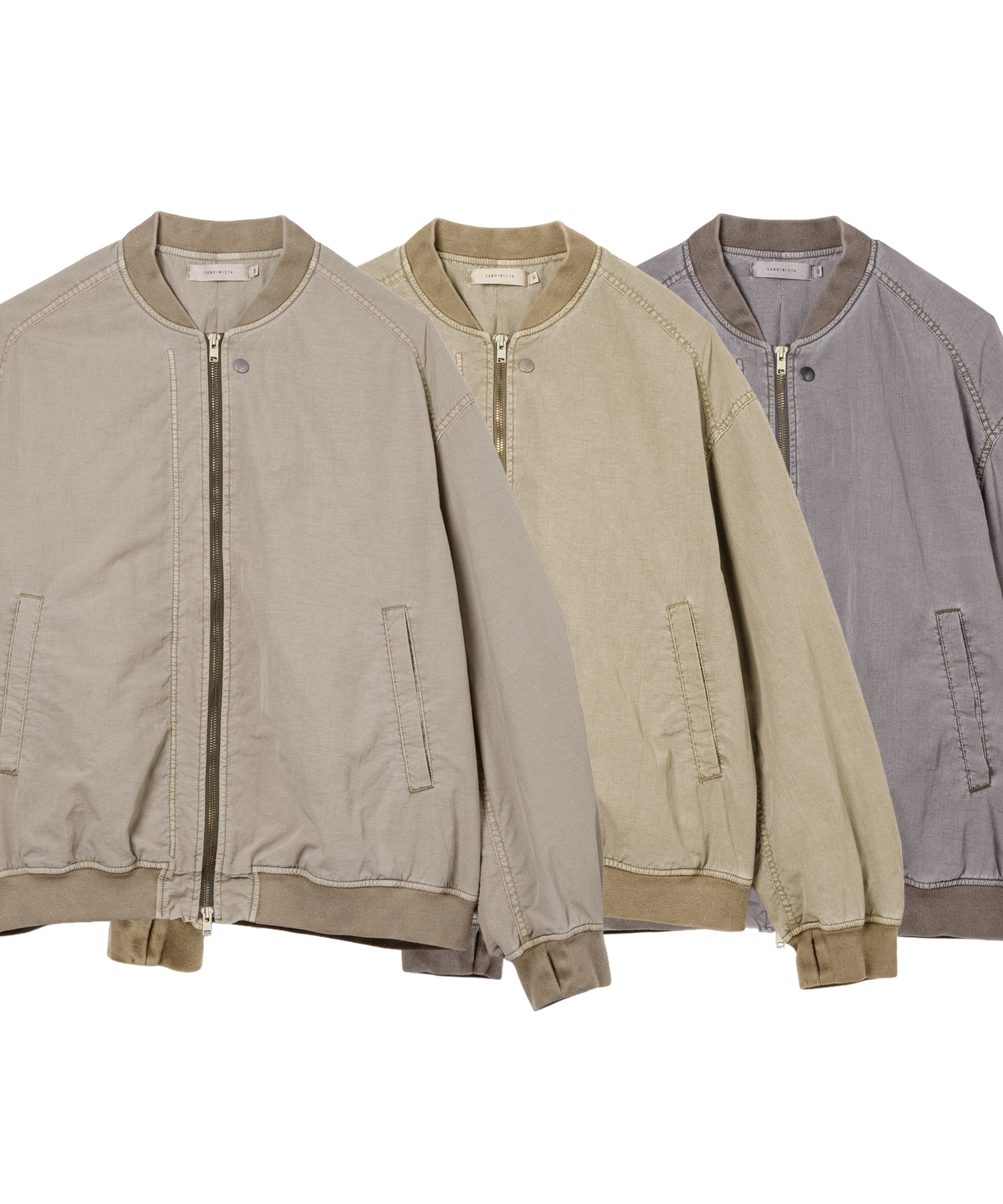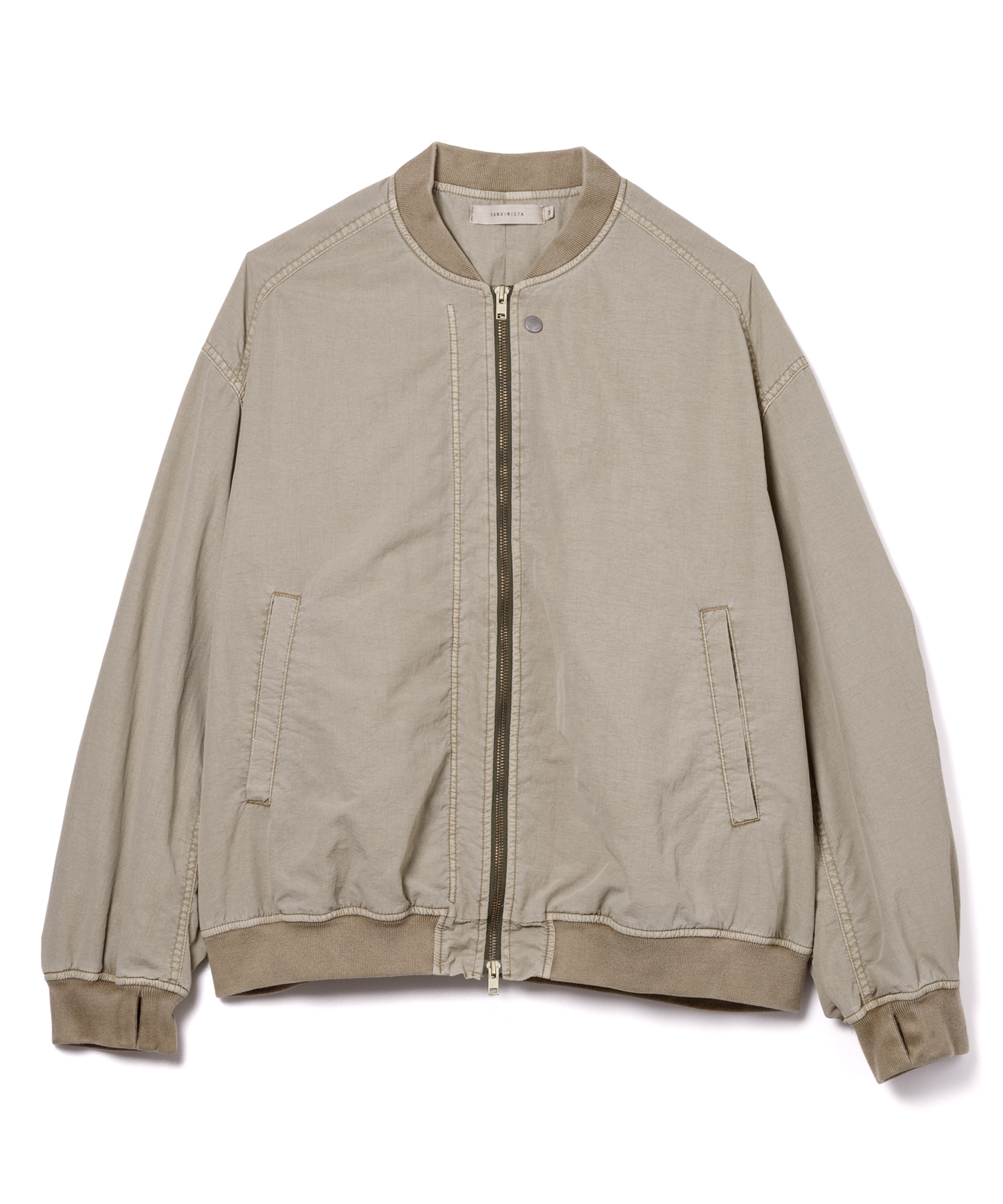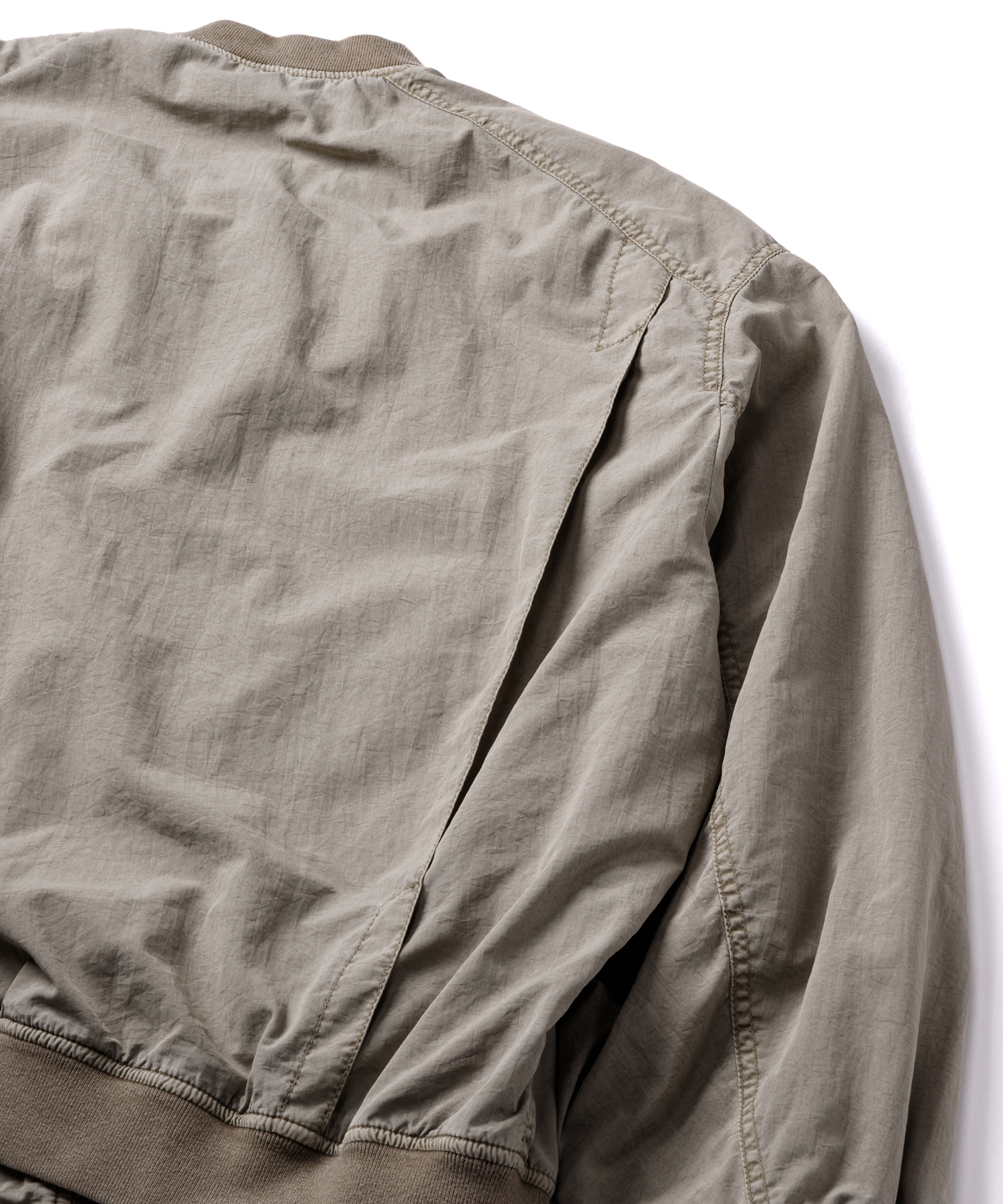 高密度ナイロンを特殊な酸性染料で製品染めを施した、ボンバージャケットです。特徴は特殊染料を使用の為、高温処理が不要で繊維へのダメージが少なく、製品染めでも柔らかくナチュラルな仕上がりになってます。また深みのあるムラ感、製品染めならではの染色ムラがあるのが特徴です。シルエットの特徴は身幅が広く、着丈は短い仕様です。後身にはビンテージ感のある深めアクションプリーツがあります。