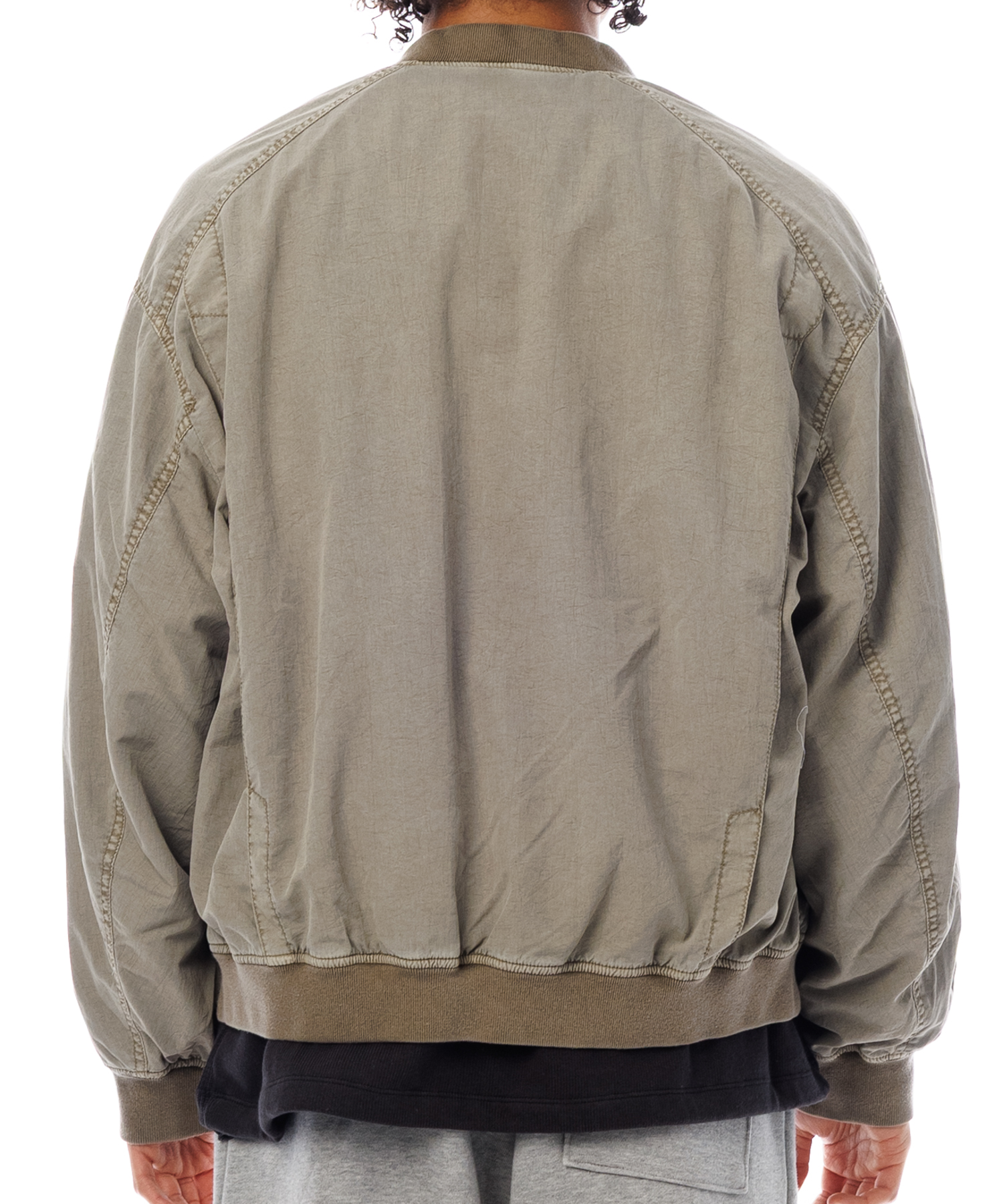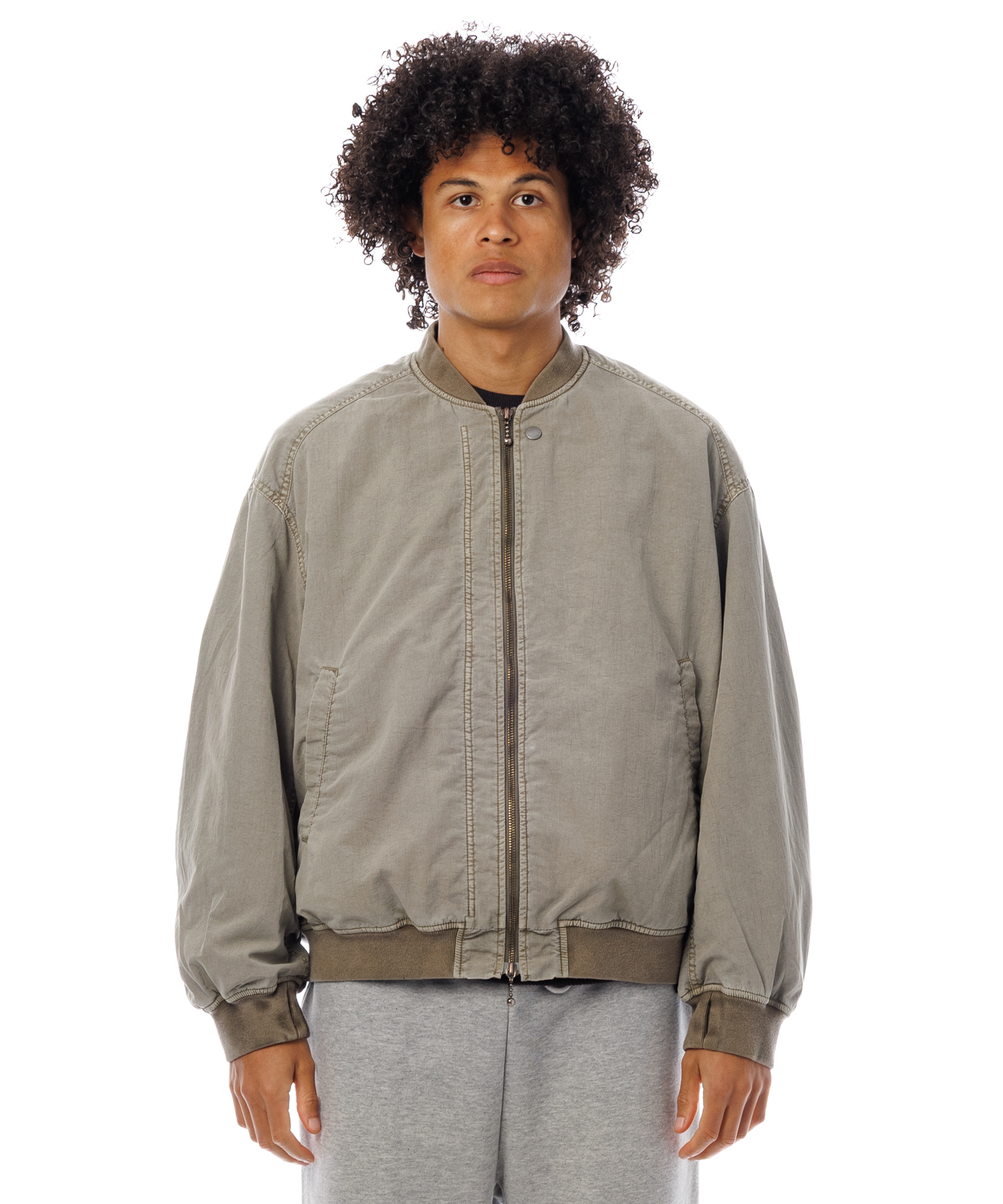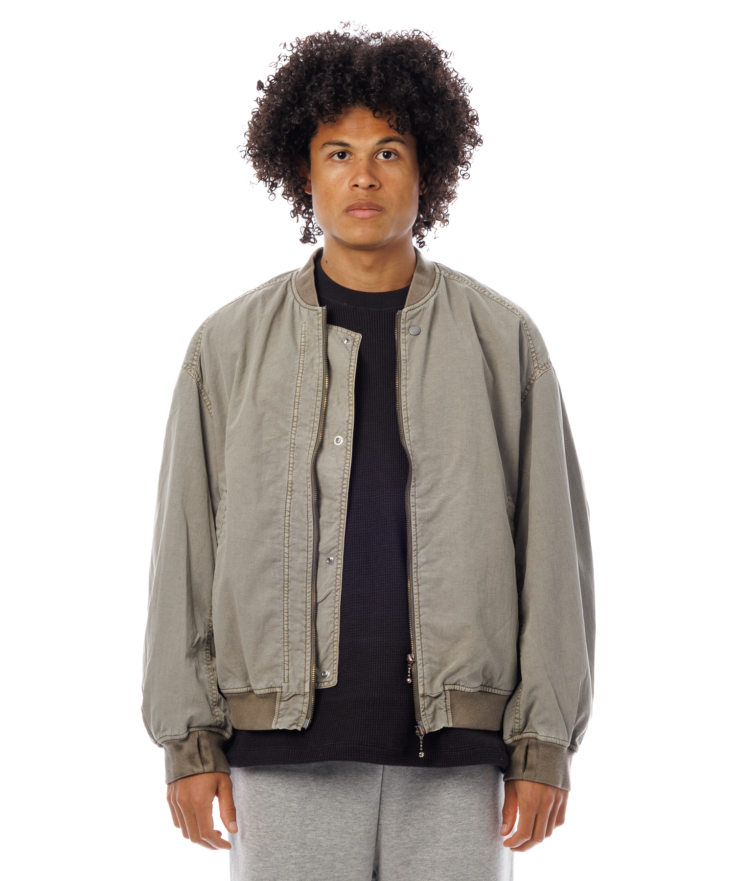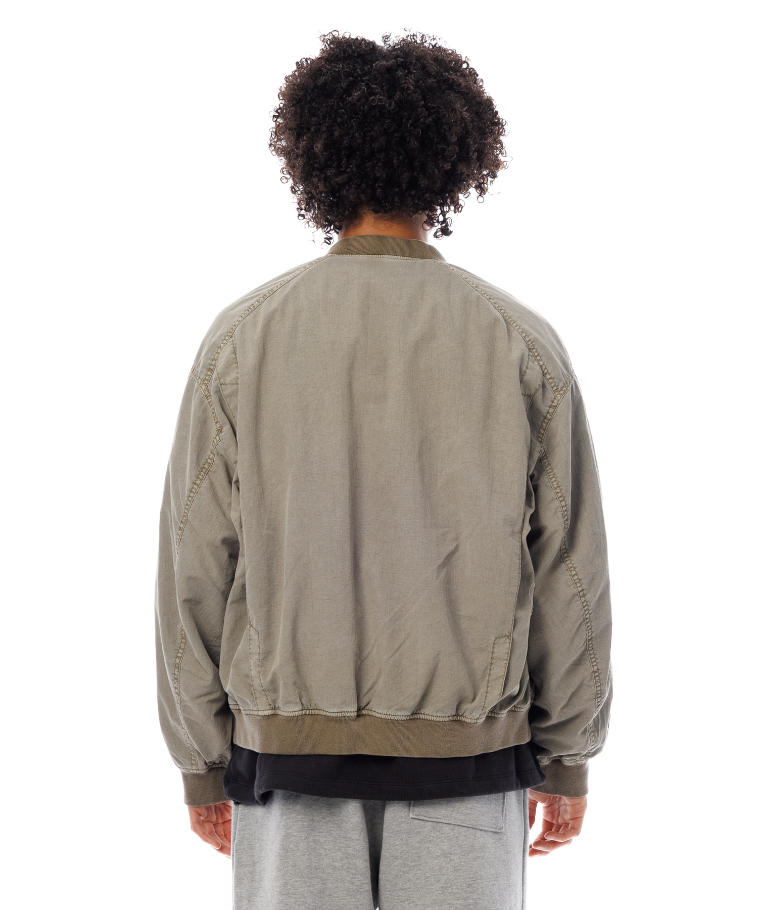 高密度ナイロンを特殊な酸性染料で製品染めを施した、ボンバージャケットです。特徴は特殊染料を使用の為、高温処理が不要で繊維へのダメージが少なく、製品染めでも柔らかくナチュラルな仕上がりになってます。また深みのあるムラ感、製品染めならではの染色ムラがあるのが特徴です。シルエットの特徴は身幅が広く、着丈は短い仕様です。後身にはビンテージ感のある深めアクションプリーツがあります。