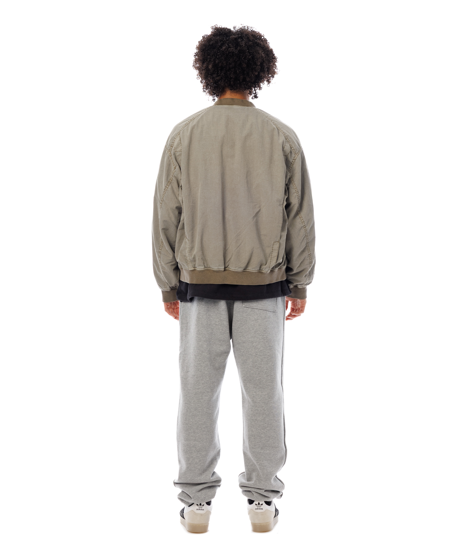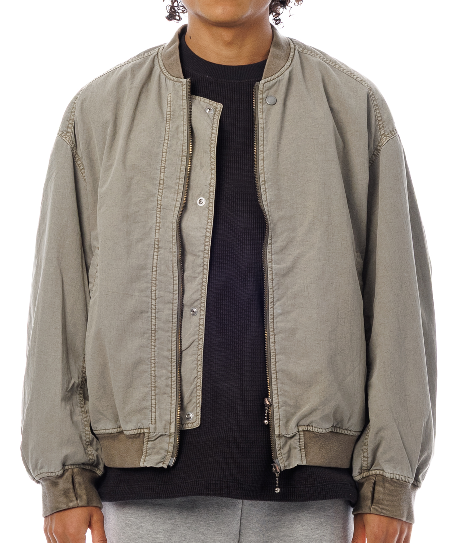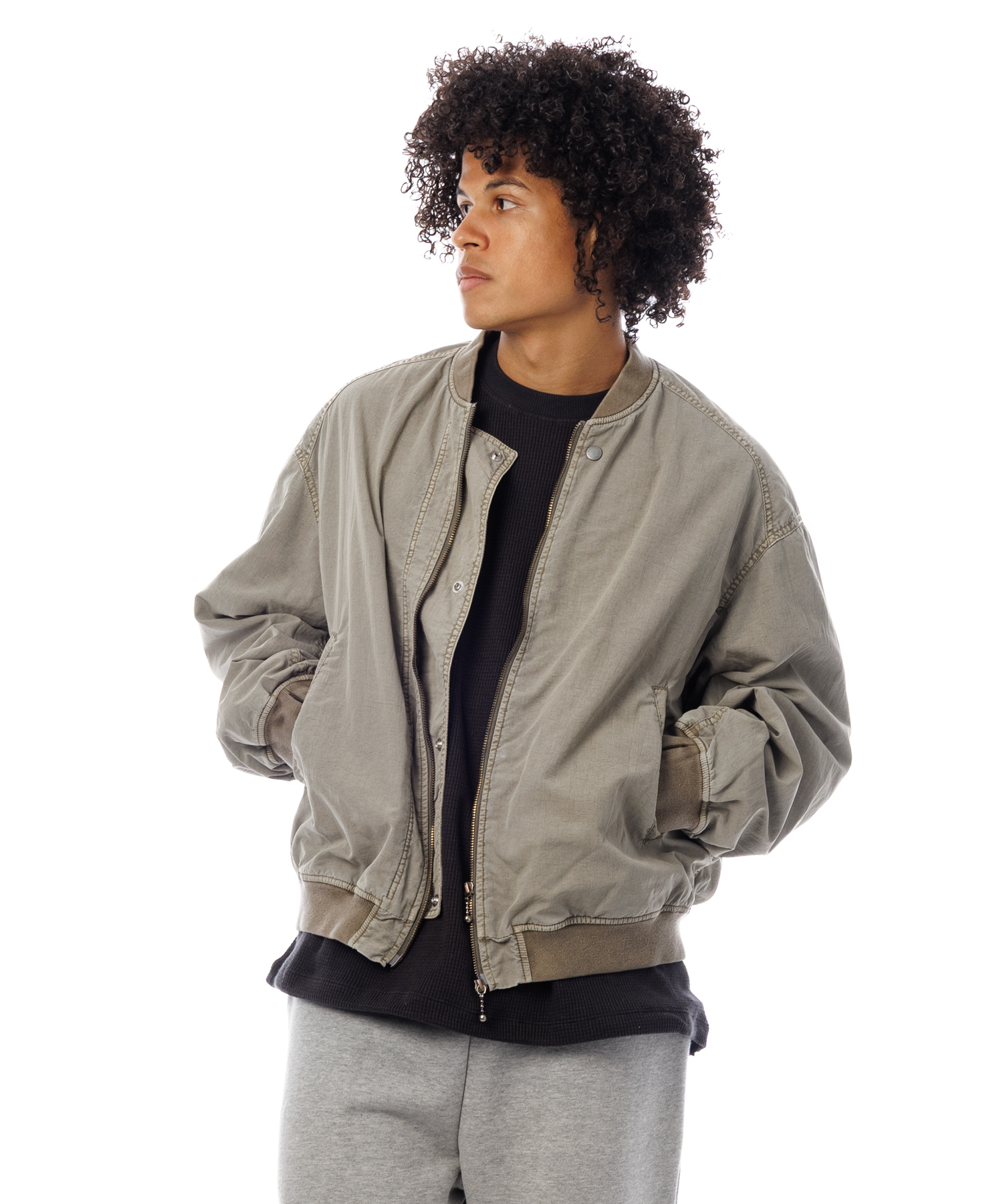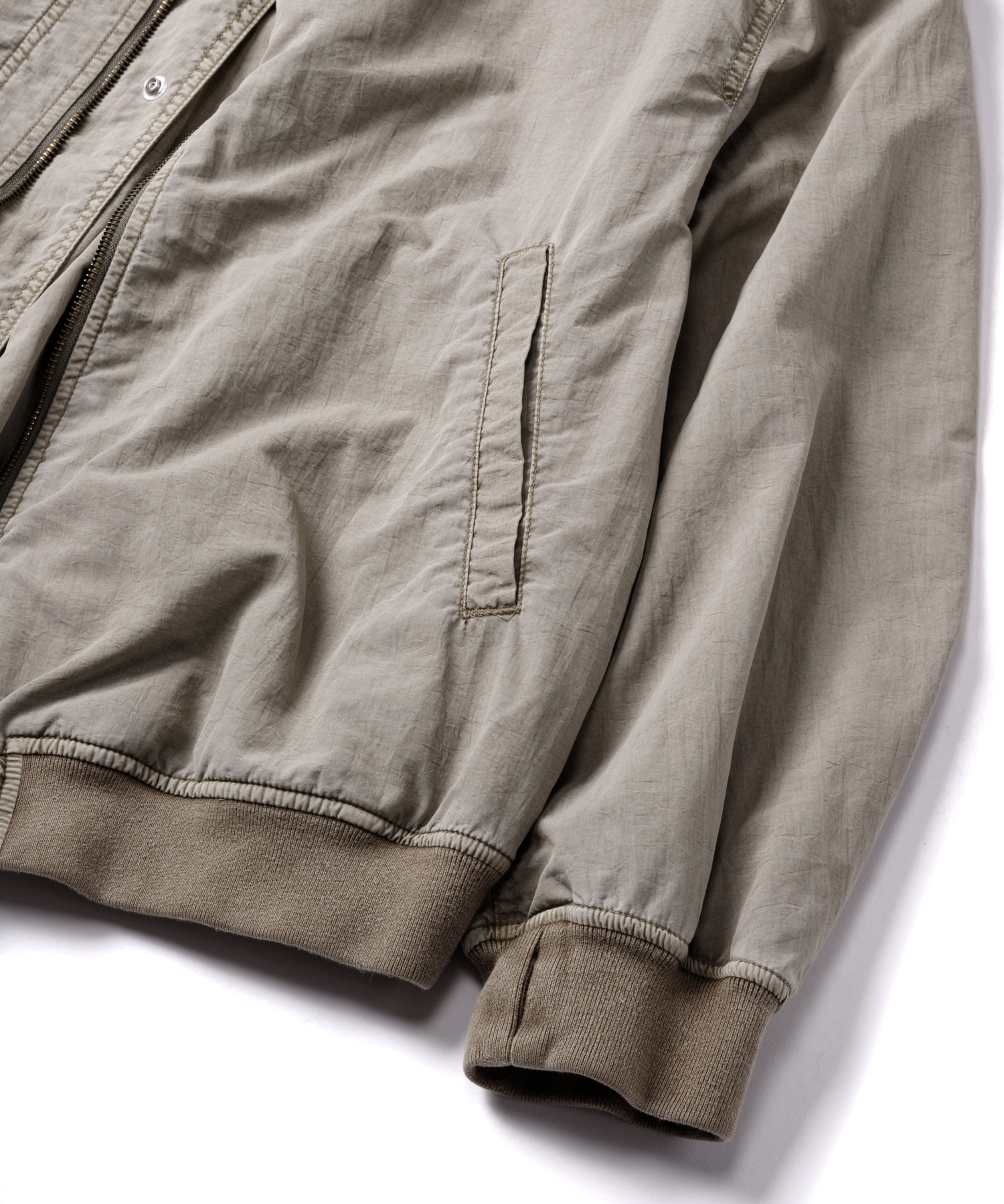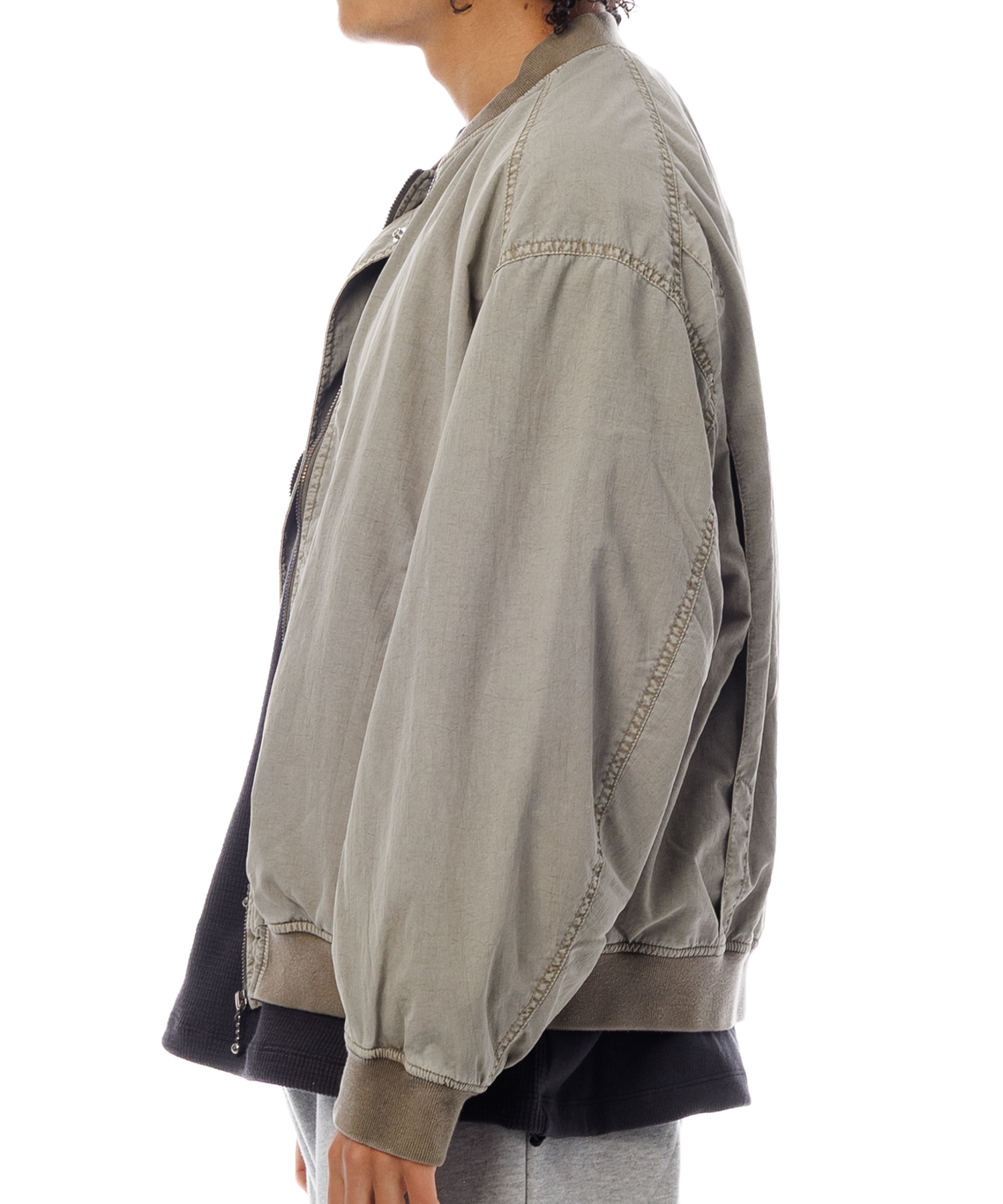 高密度ナイロンを特殊な酸性染料で製品染めを施した、ボンバージャケットです。特徴は特殊染料を使用の為、高温処理が不要で繊維へのダメージが少なく、製品染めでも柔らかくナチュラルな仕上がりになってます。また深みのあるムラ感、製品染めならではの染色ムラがあるのが特徴です。シルエットの特徴は身幅が広く、着丈は短い仕様です。後身にはビンテージ感のある深めアクションプリーツがあります。