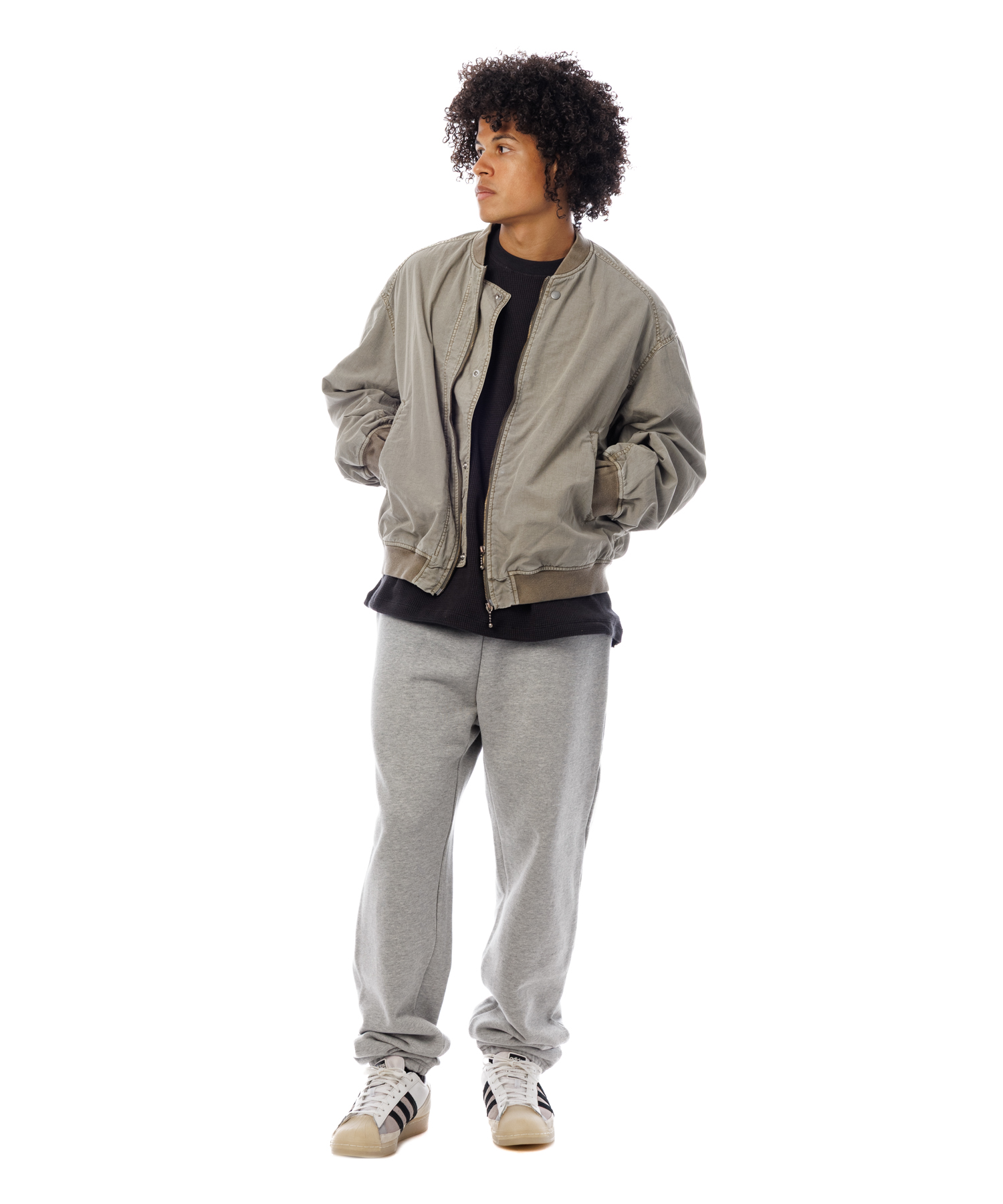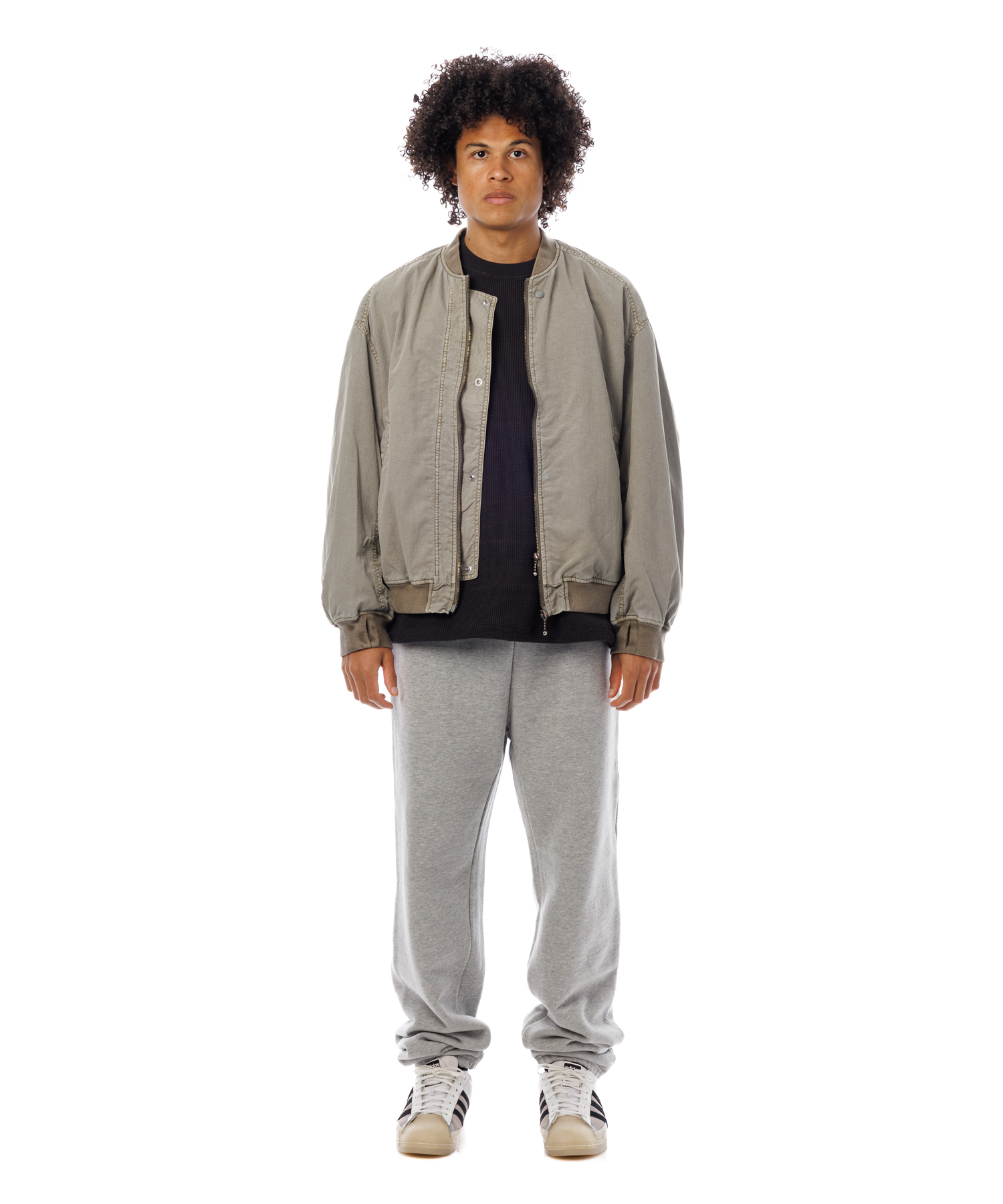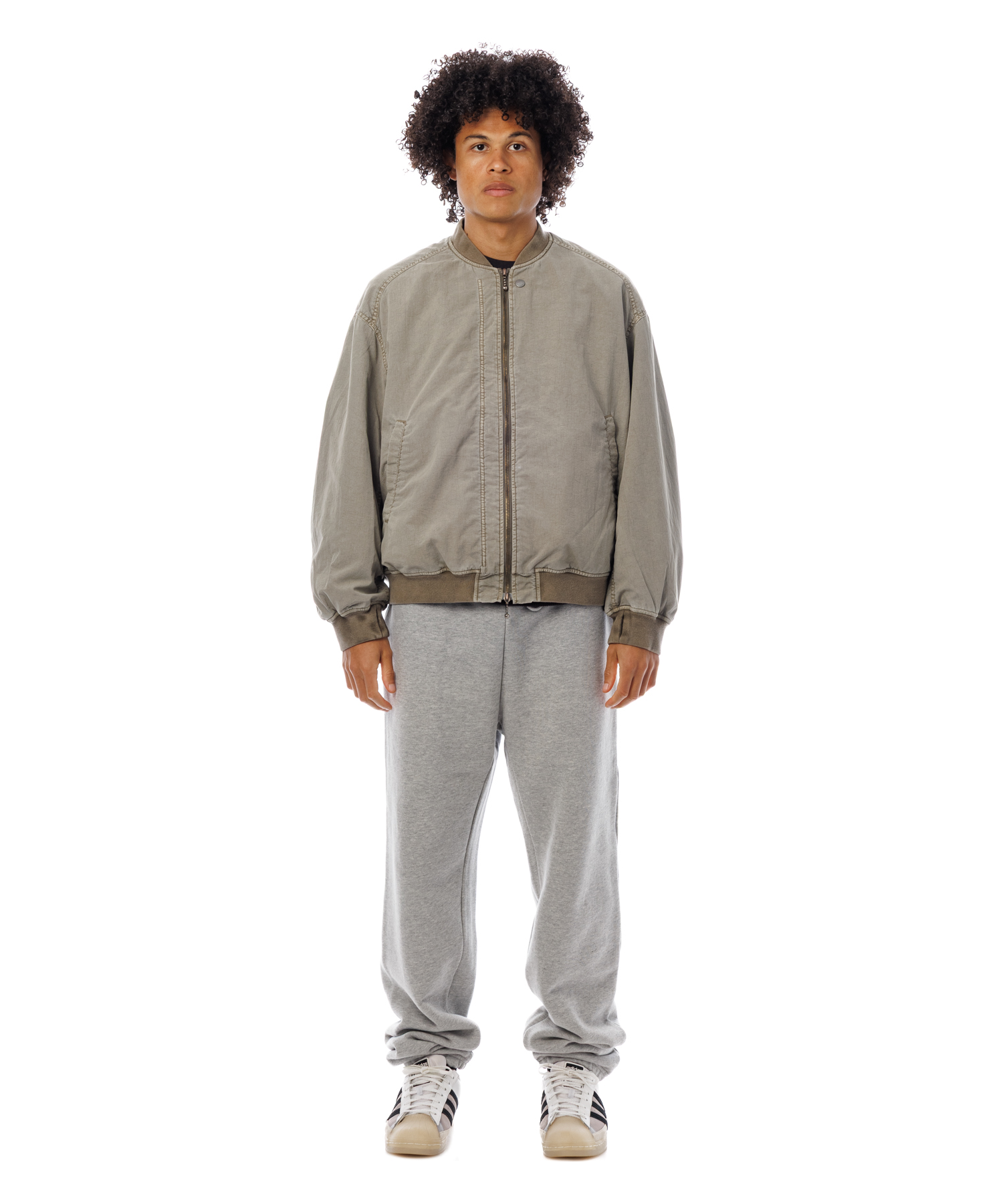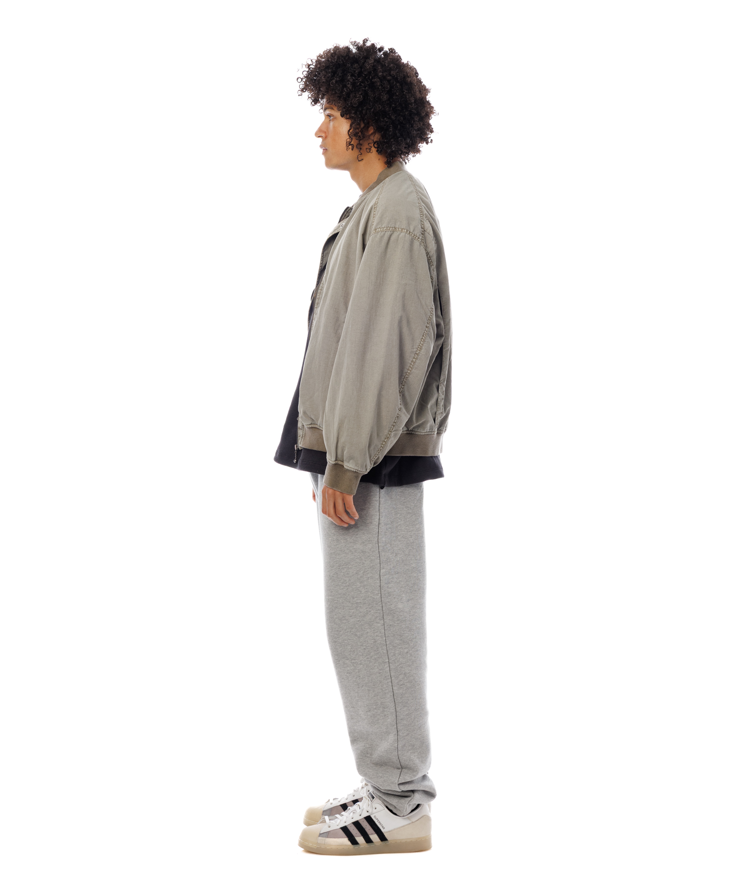 高密度ナイロンを特殊な酸性染料で製品染めを施した、ボンバージャケットです。特徴は特殊染料を使用の為、高温処理が不要で繊維へのダメージが少なく、製品染めでも柔らかくナチュラルな仕上がりになってます。また深みのあるムラ感、製品染めならではの染色ムラがあるのが特徴です。シルエットの特徴は身幅が広く、着丈は短い仕様です。後身にはビンテージ感のある深めアクションプリーツがあります。