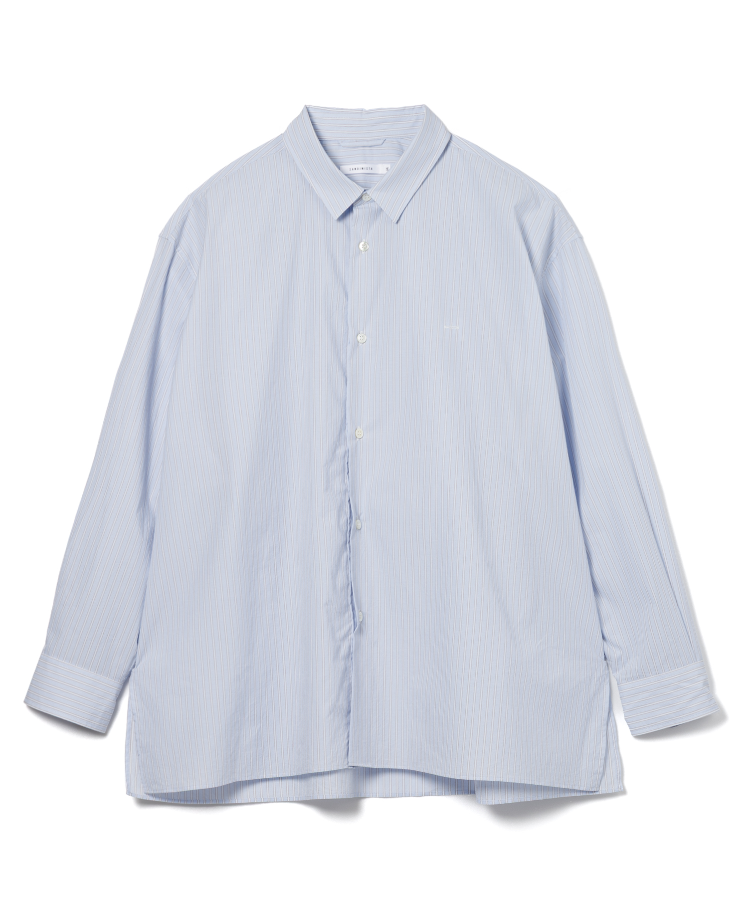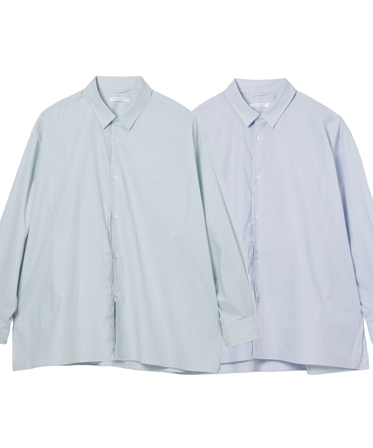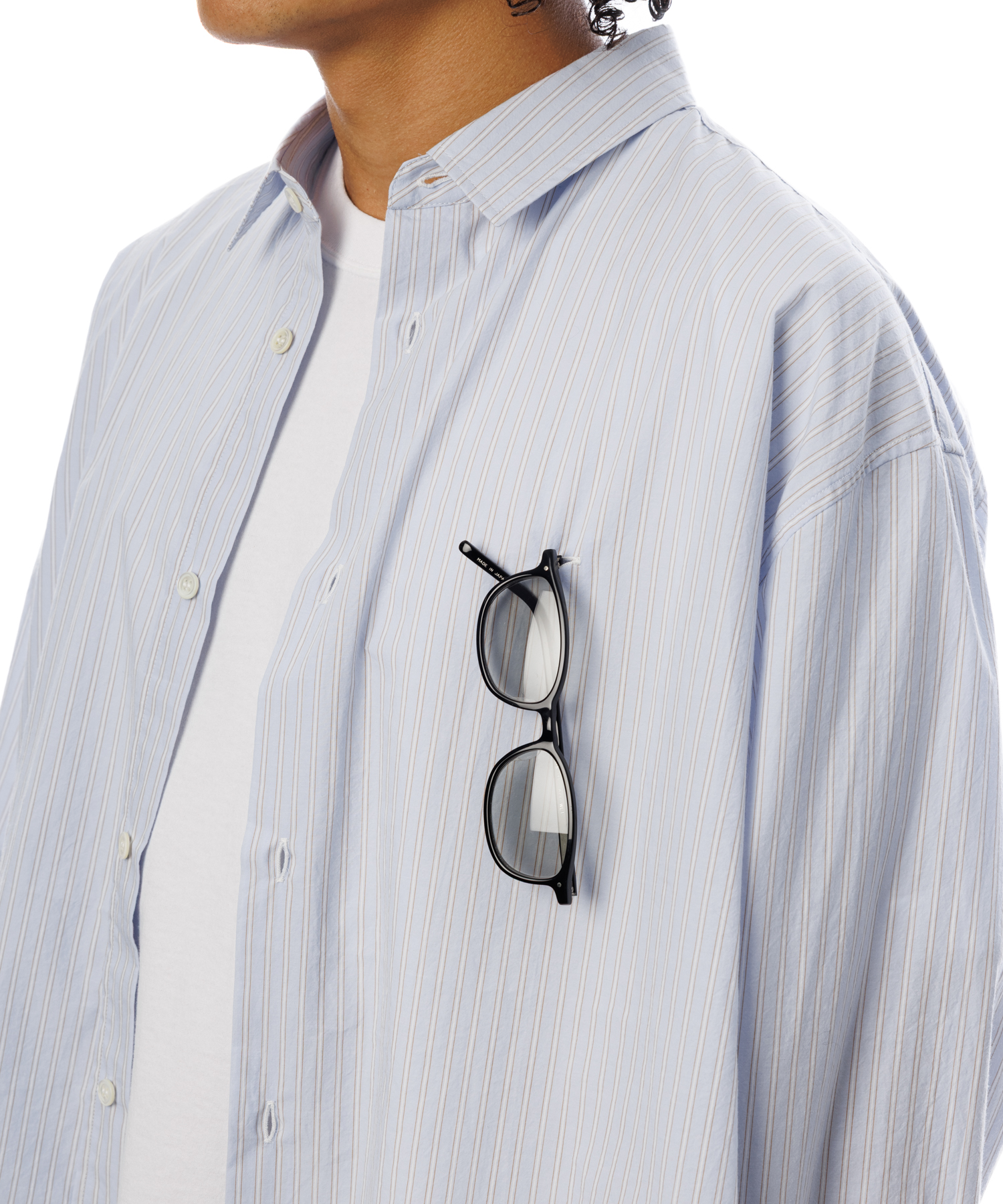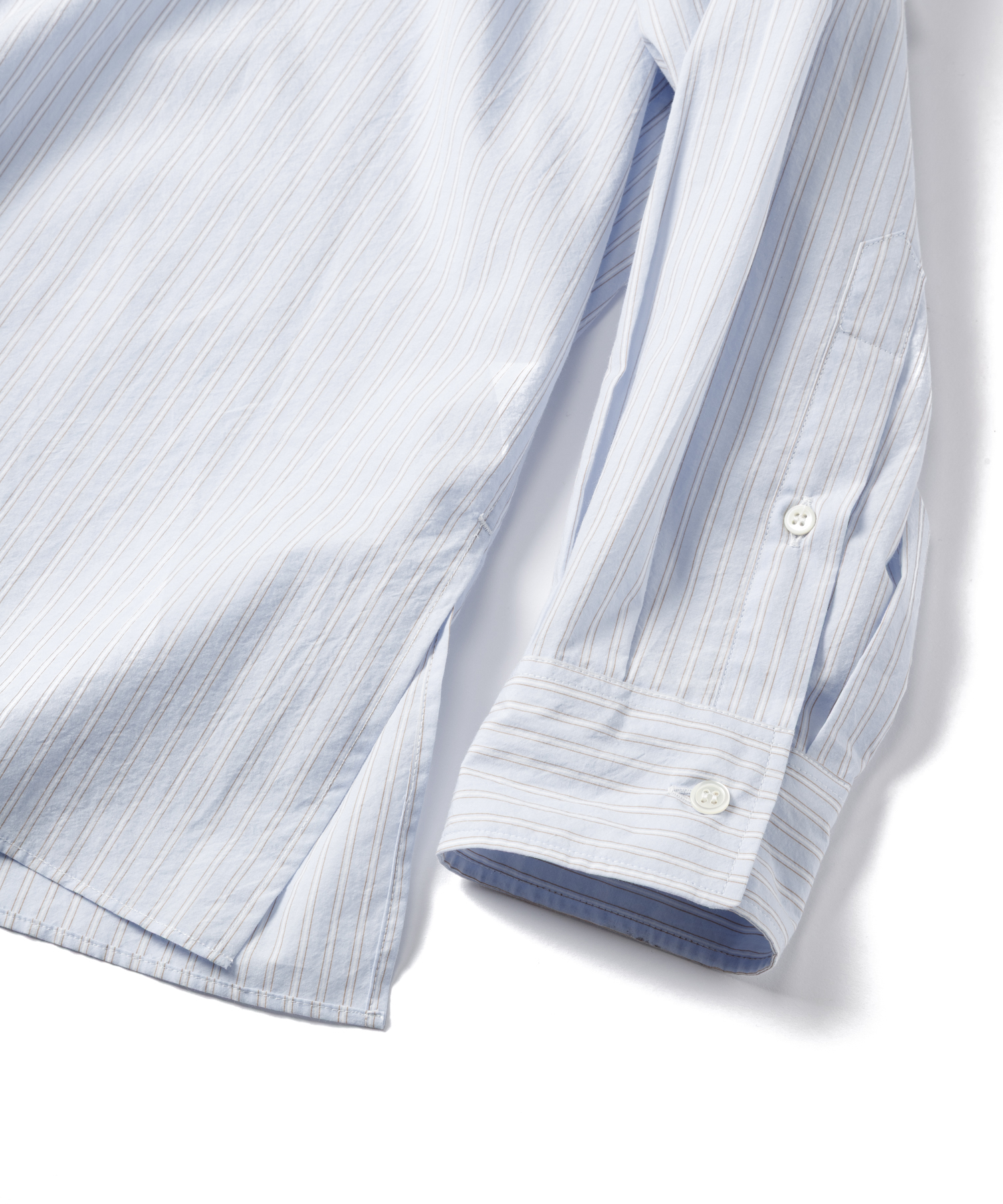 80/1超長綿を使用した、胸にグラスホール付きリゾートストライプシャツです。シルエットは通常のシャツより大きめになります。生地の特徴は特殊柔軟を用いて滑らかさと反発感を追求し、洗い加工を施している為、上質な肌触り感があり着心地は抜群です。