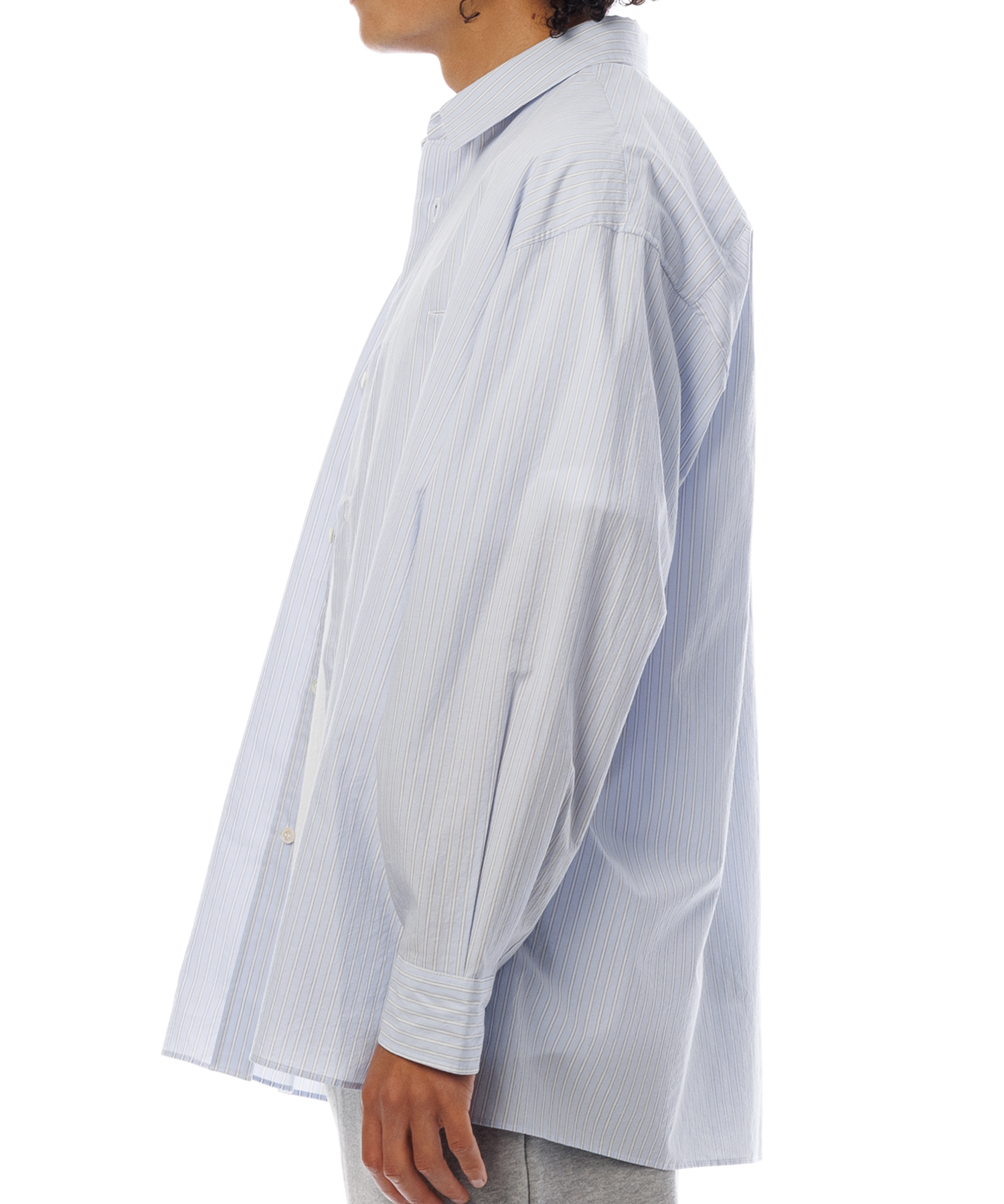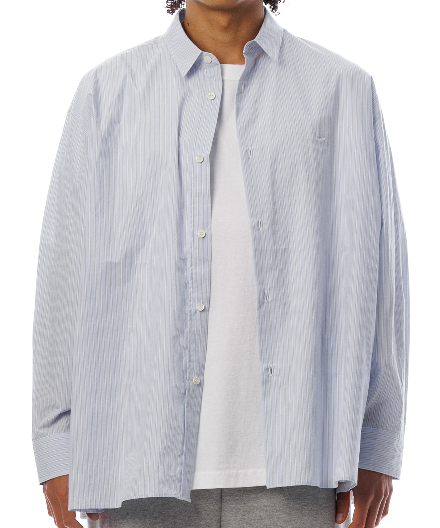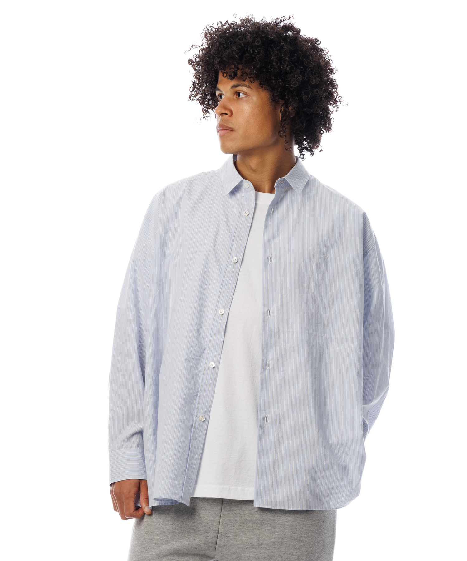 80/1超長綿を使用した、胸にグラスホール付きリゾートストライプシャツです。シルエットは通常のシャツより大きめになります。生地の特徴は特殊柔軟を用いて滑らかさと反発感を追求し、洗い加工を施している為、上質な肌触り感があり着心地は抜群です。