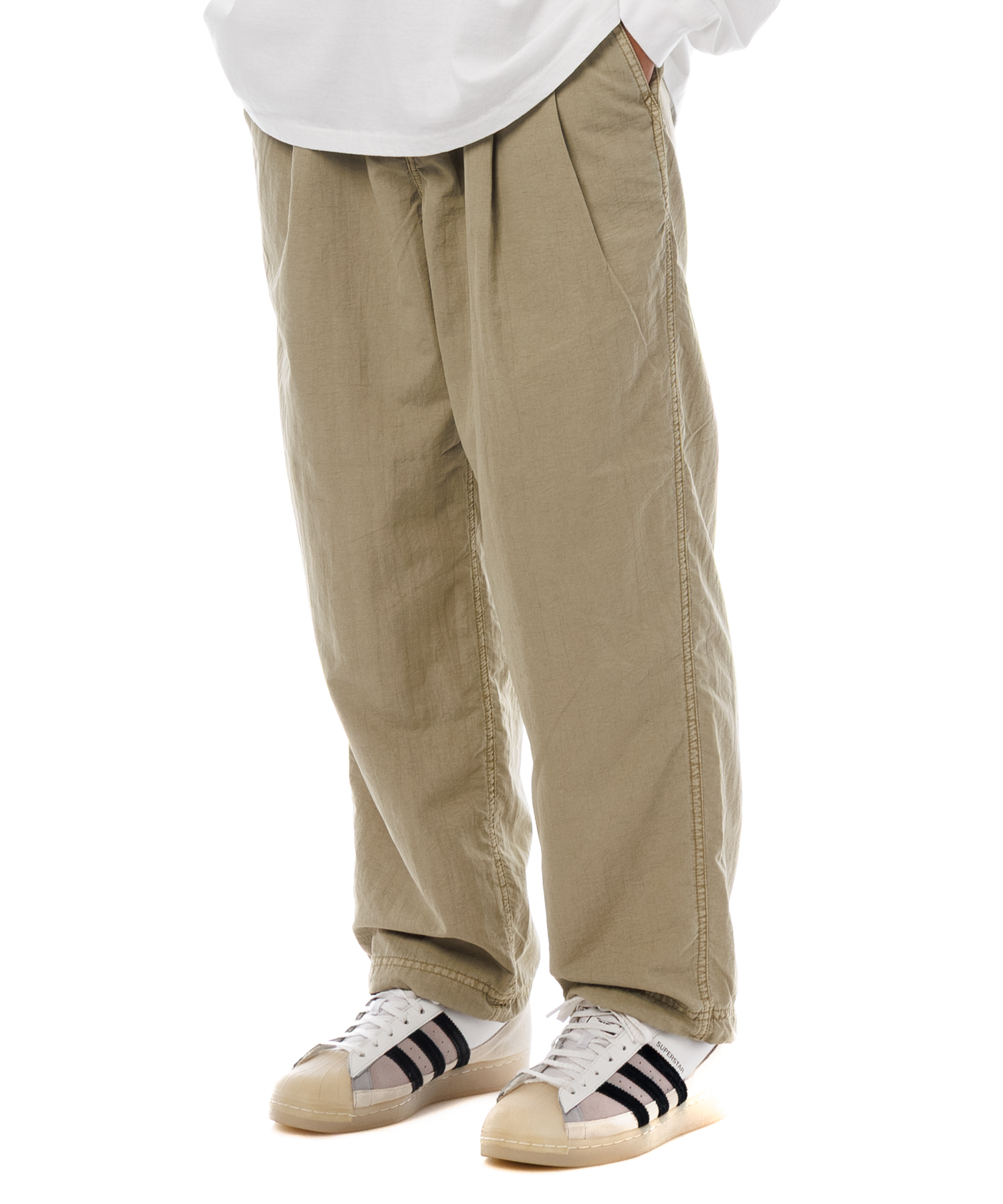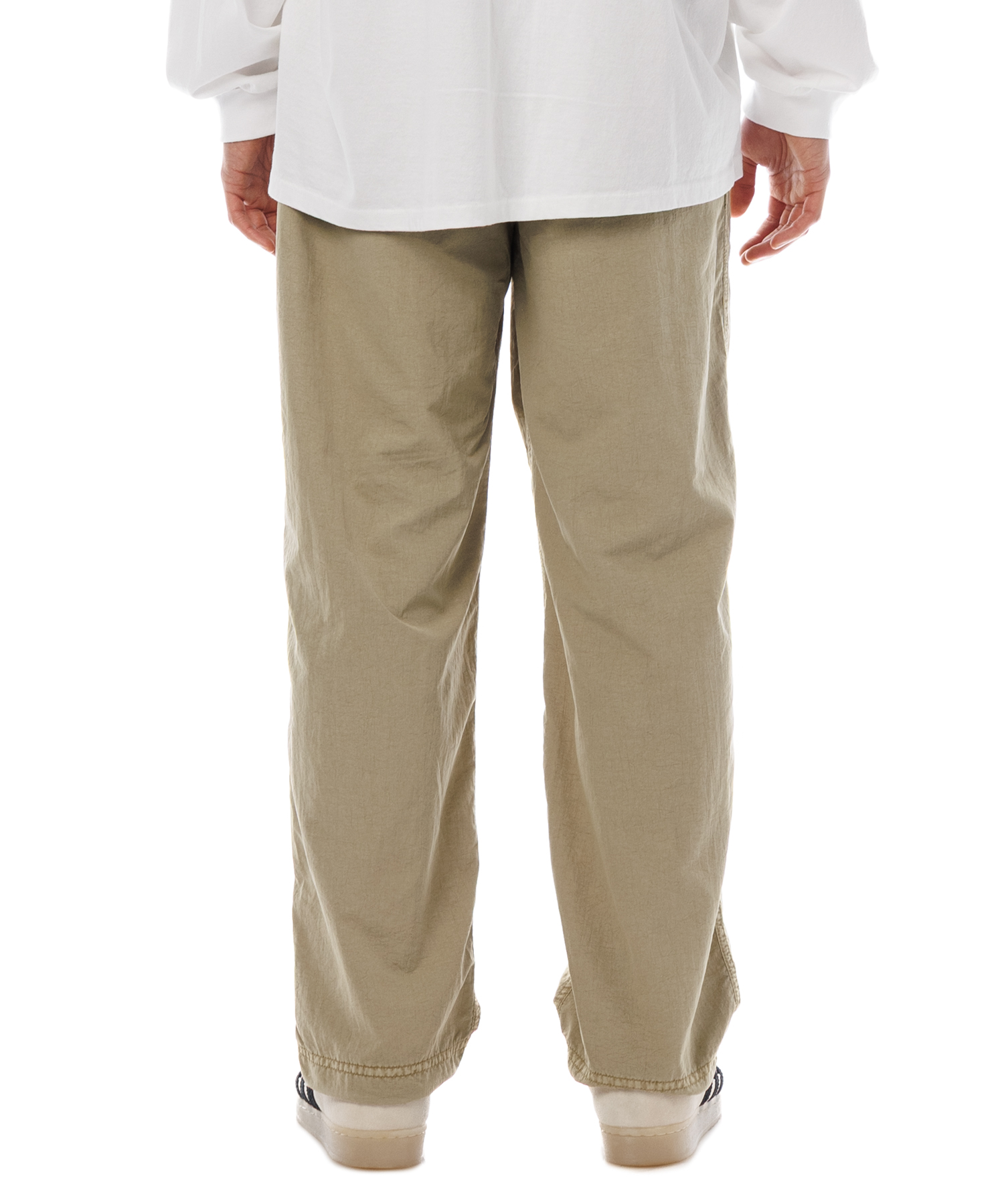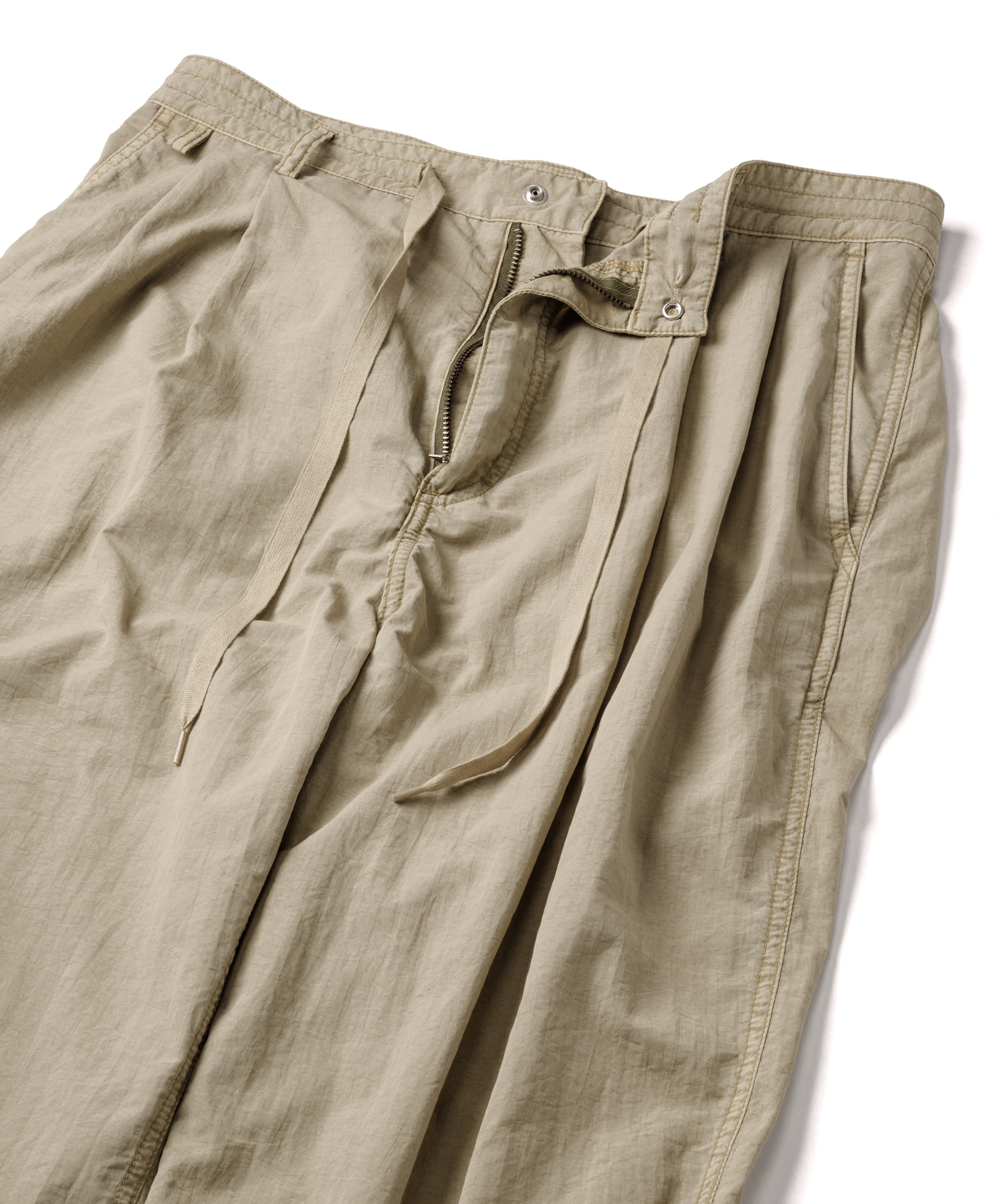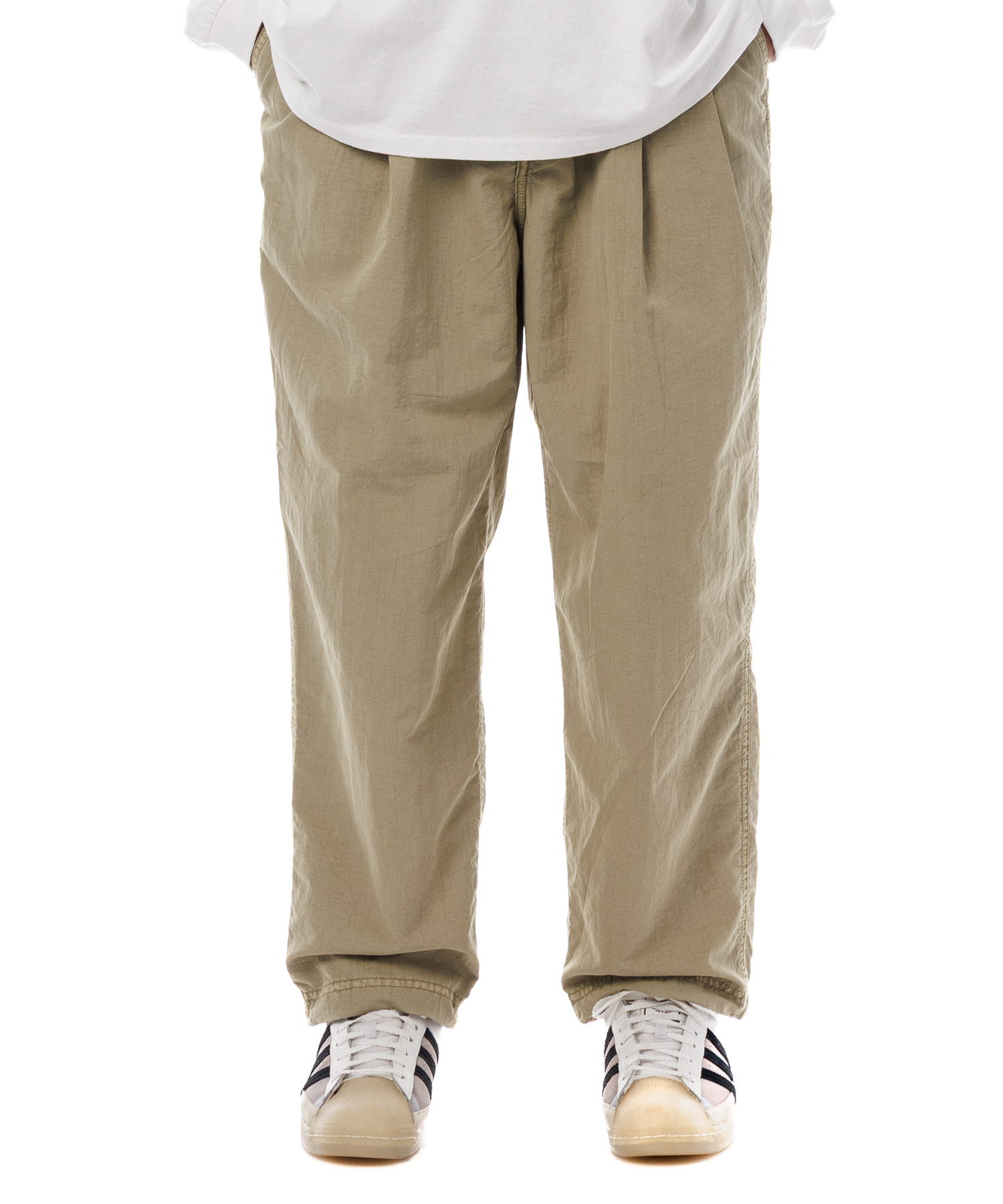 高密度ナイロンを特殊な酸性染料で製品染めを施した、2タック入りパンツです。加工の特徴は特殊染料を使用の為、高温処理が不要で繊維へのダメージが少なく、製品染めでも柔らかくナチュラルな仕上がりになってます。また深みのあるムラ感、製品染めならではの染色ムラがあるのが特徴です。裾にはゴム紐が通ってますので、シーンに合わせて絞れます。