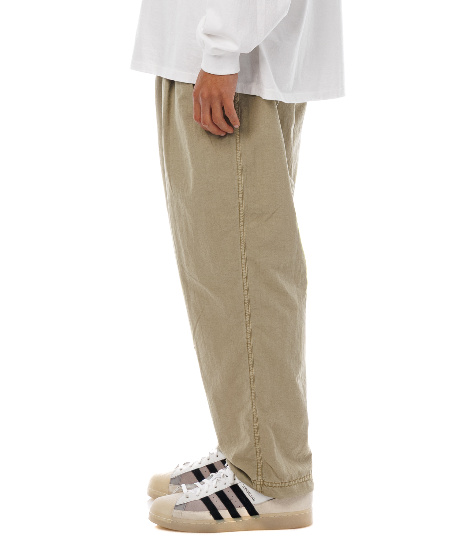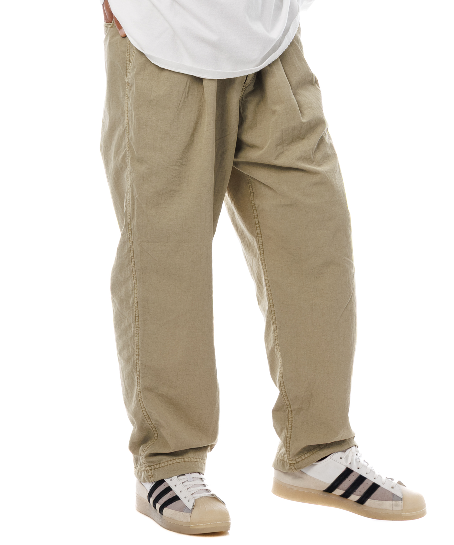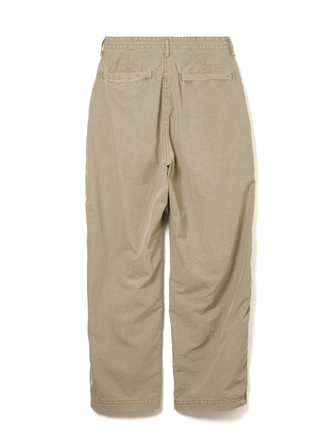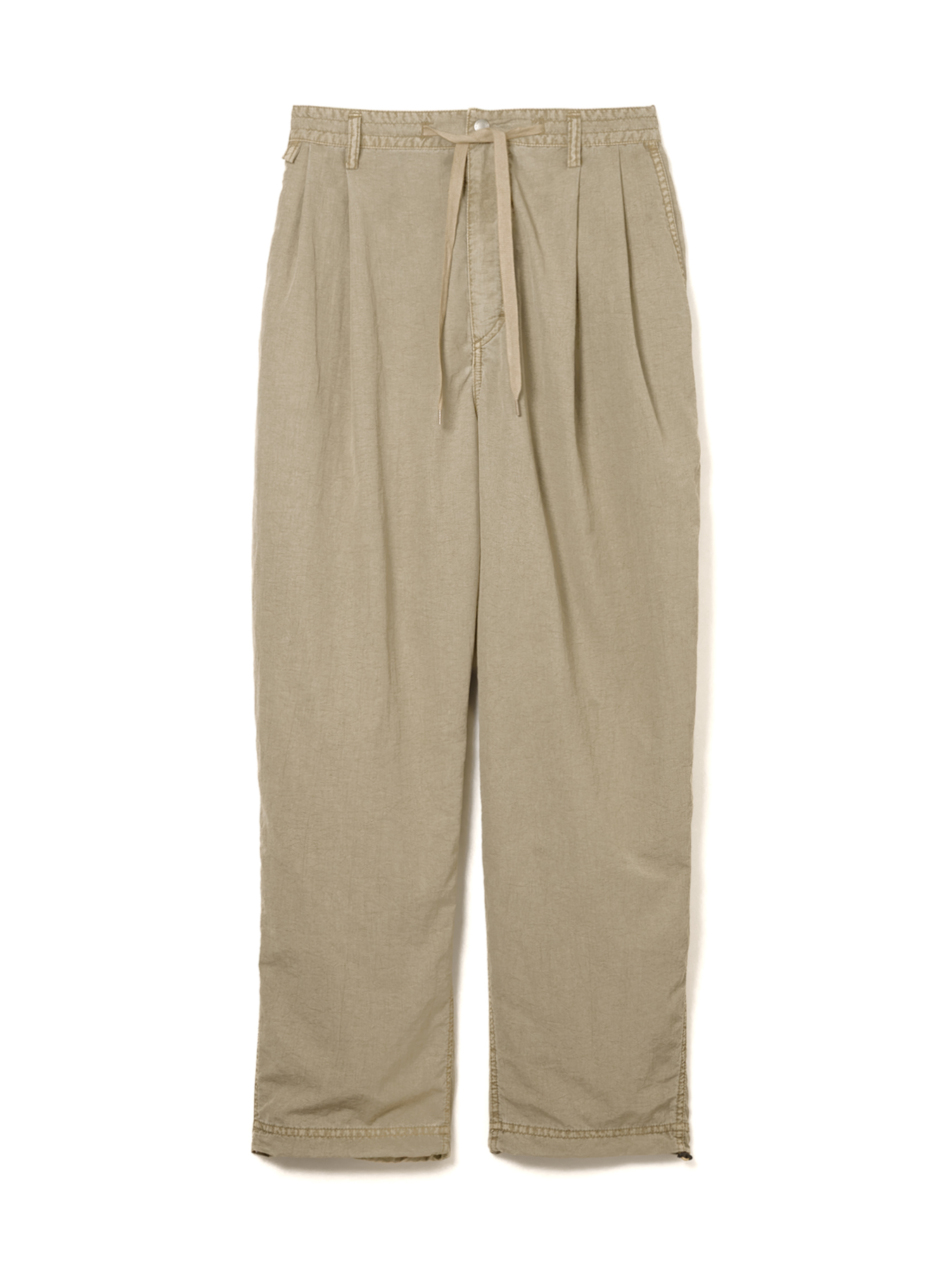 高密度ナイロンを特殊な酸性染料で製品染めを施した、2タック入りパンツです。加工の特徴は特殊染料を使用の為、高温処理が不要で繊維へのダメージが少なく、製品染めでも柔らかくナチュラルな仕上がりになってます。また深みのあるムラ感、製品染めならではの染色ムラがあるのが特徴です。裾にはゴム紐が通ってますので、シーンに合わせて絞れます。