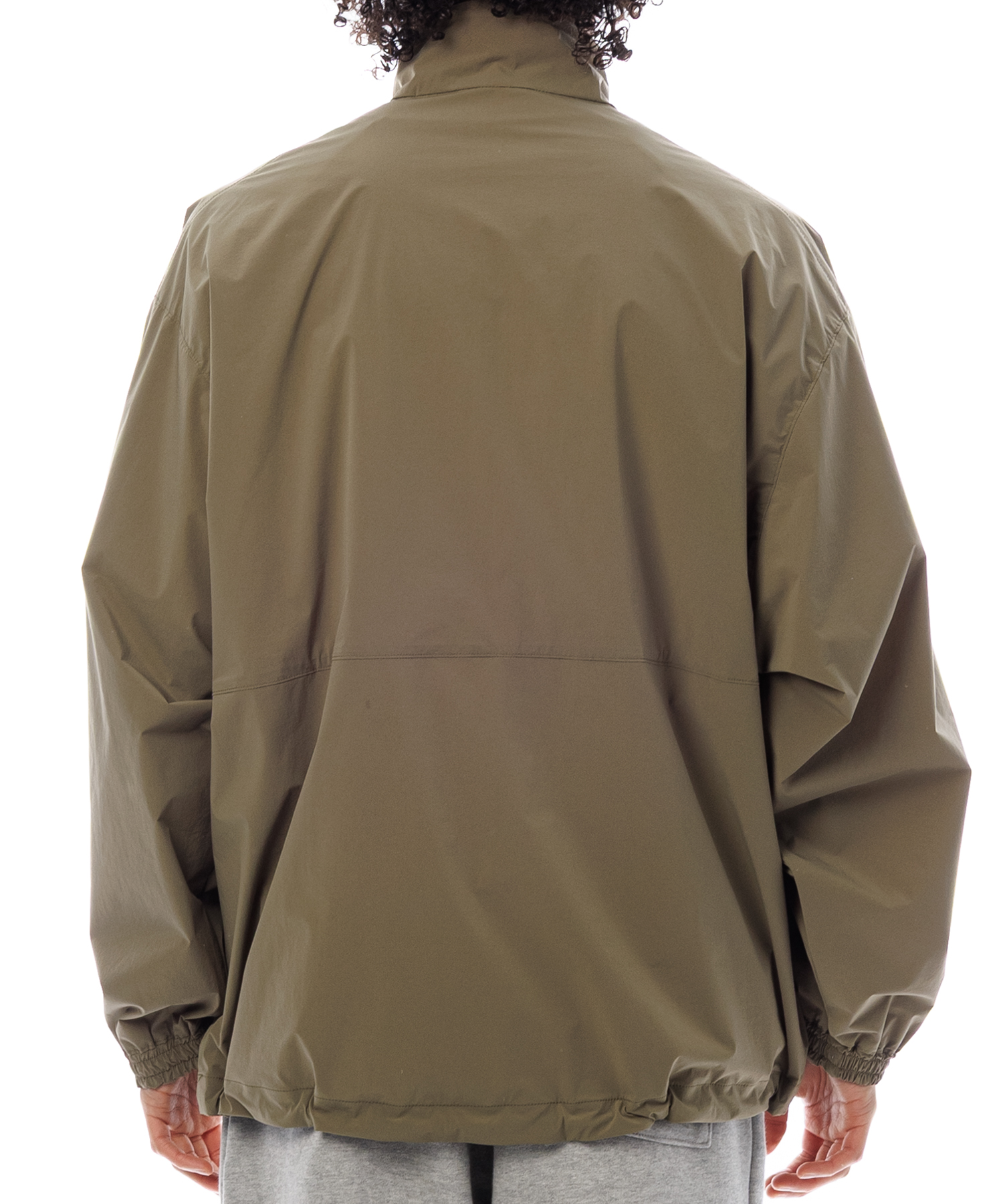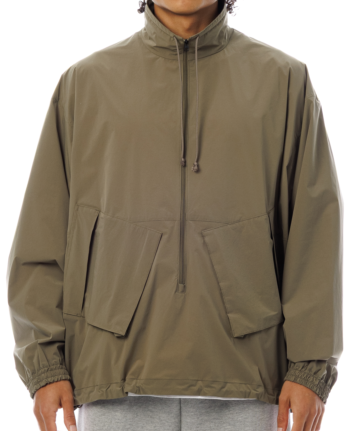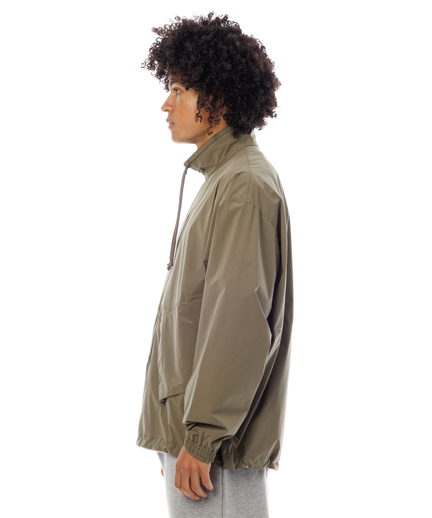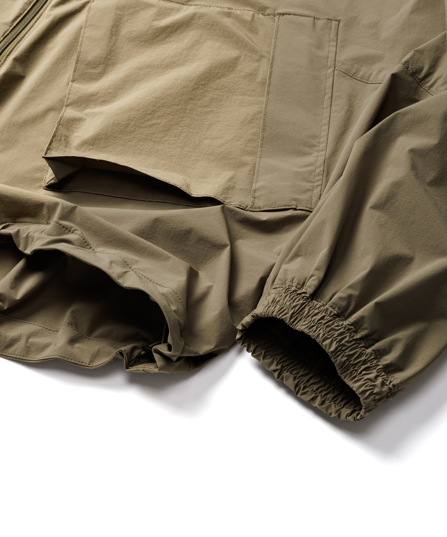 伸縮性 (4Way)に優れた薄手タフタ生地を使用した、アノラックジャケットです。生地の特徴は伸縮性に優れ、紙のような軽量感とハリ感があり、ナイロン特有ドライタッチとマット感あるのが特徴です。また撥水加工を施してますので、タウンユースからアクティブまで、シーンレスで着用いただけます。裾にはゴム紐が通ってますので、シーンに合わせて絞れます。