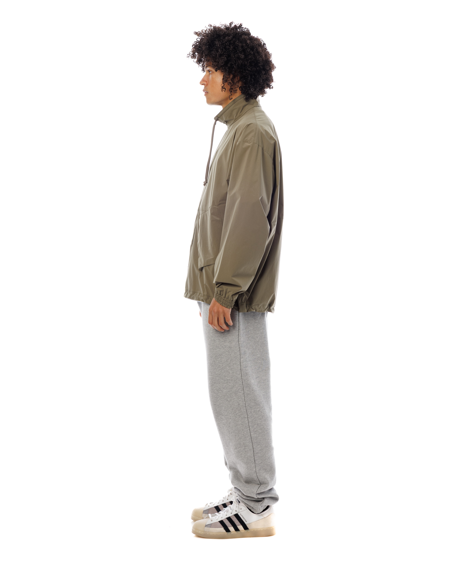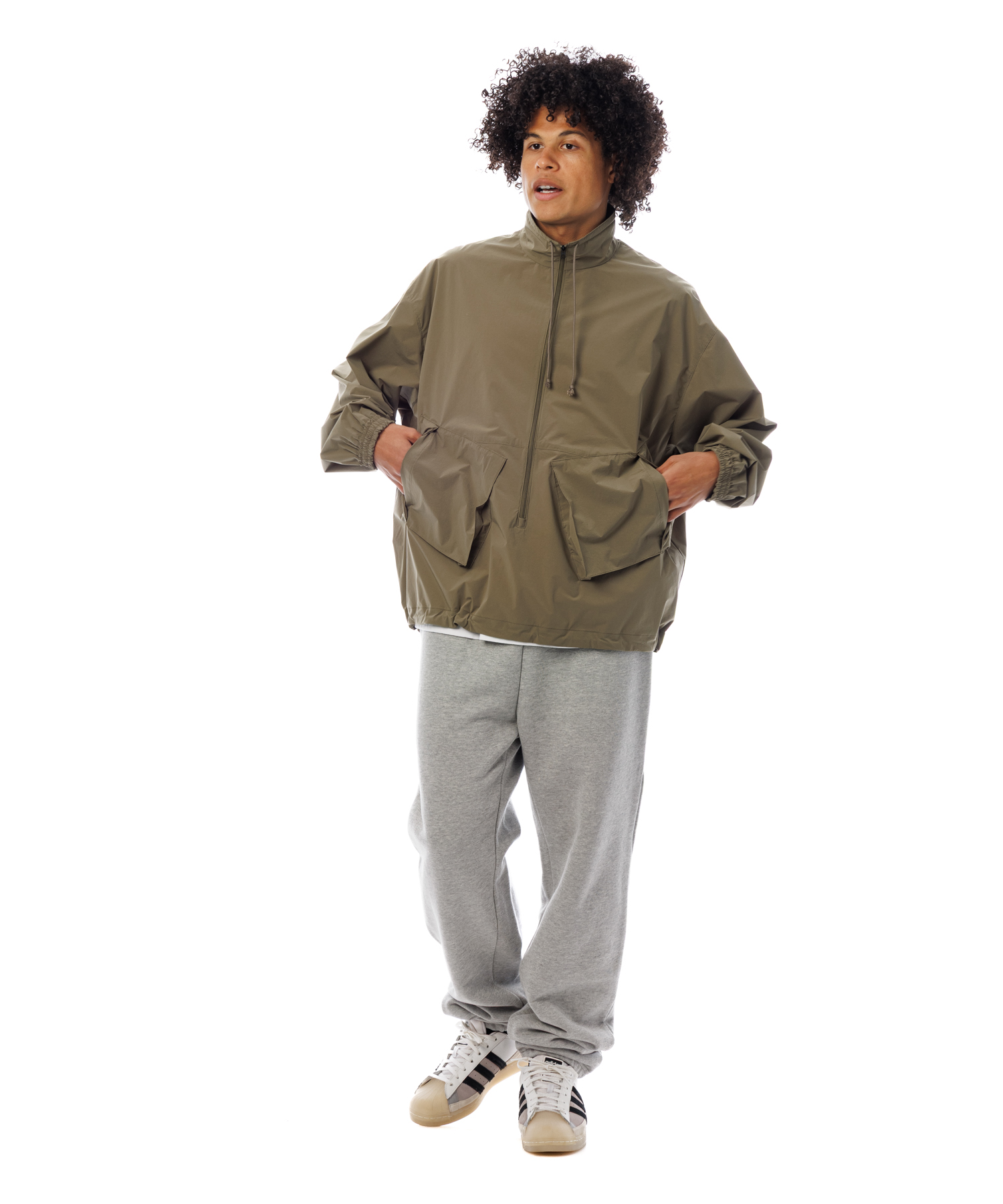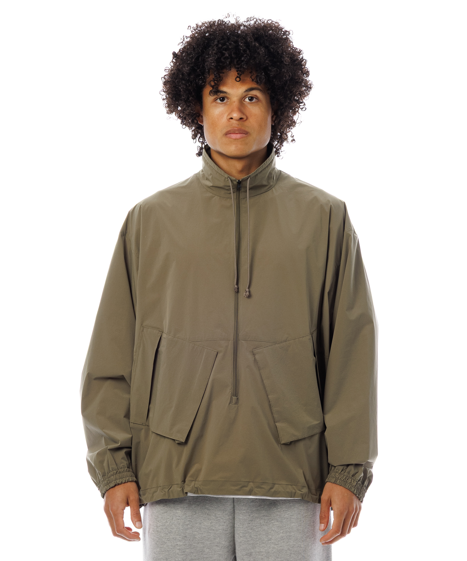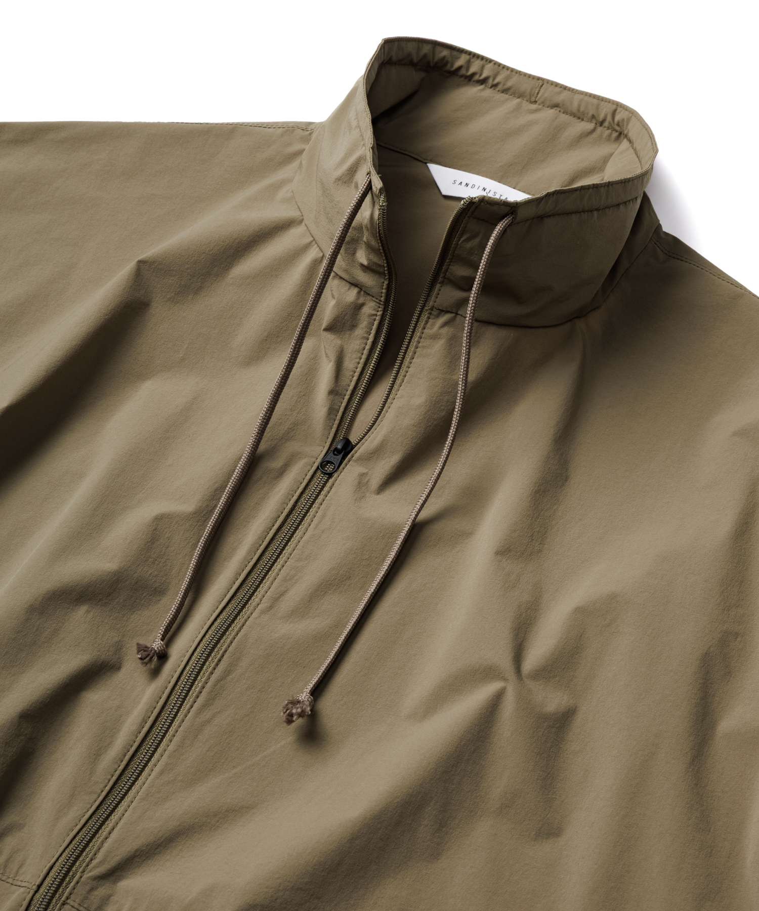 伸縮性 (4Way)に優れた薄手タフタ生地を使用した、アノラックジャケットです。生地の特徴は伸縮性に優れ、紙のような軽量感とハリ感があり、ナイロン特有ドライタッチとマット感あるのが特徴です。また撥水加工を施してますので、タウンユースからアクティブまで、シーンレスで着用いただけます。裾にはゴム紐が通ってますので、シーンに合わせて絞れます。